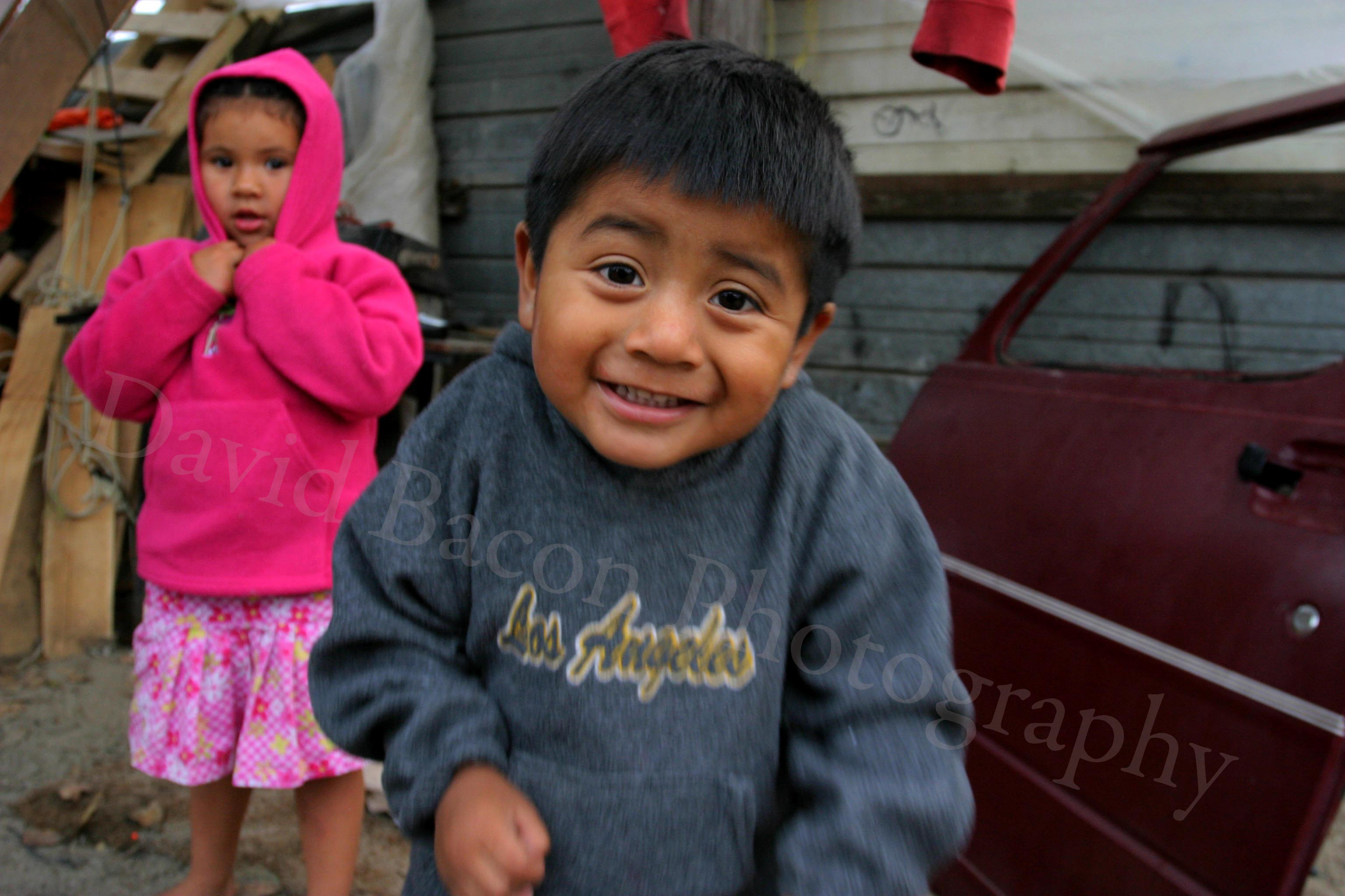 OXNARD, CA - The Parra family, Purepecha immigrants from Michoacan, sleep and live in a single room in a house in Oxnard. The Parra family are strawberry workers. From the left, Princess and Pedro Parra, playing outside of their house.
