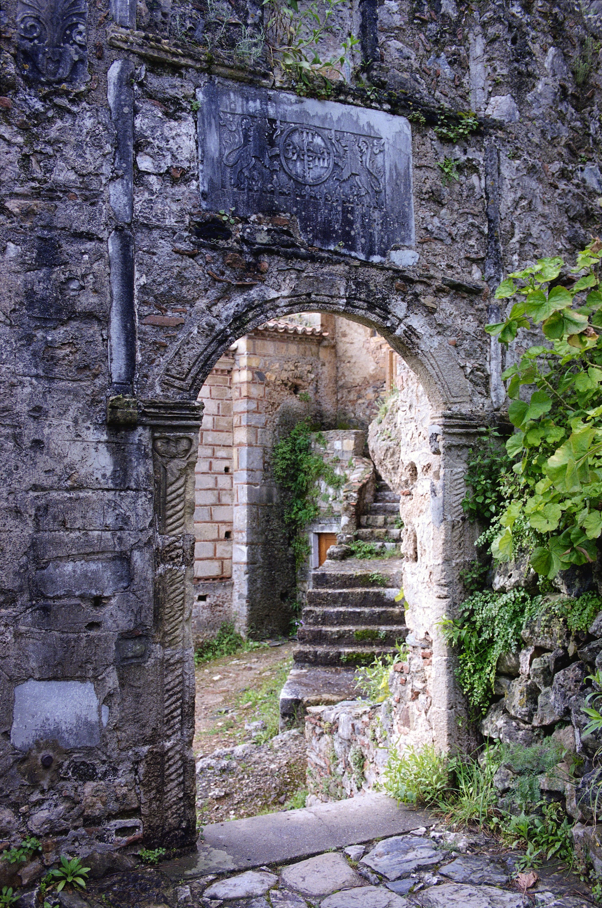 Closer view of the arched gateway w marble relief above, view S