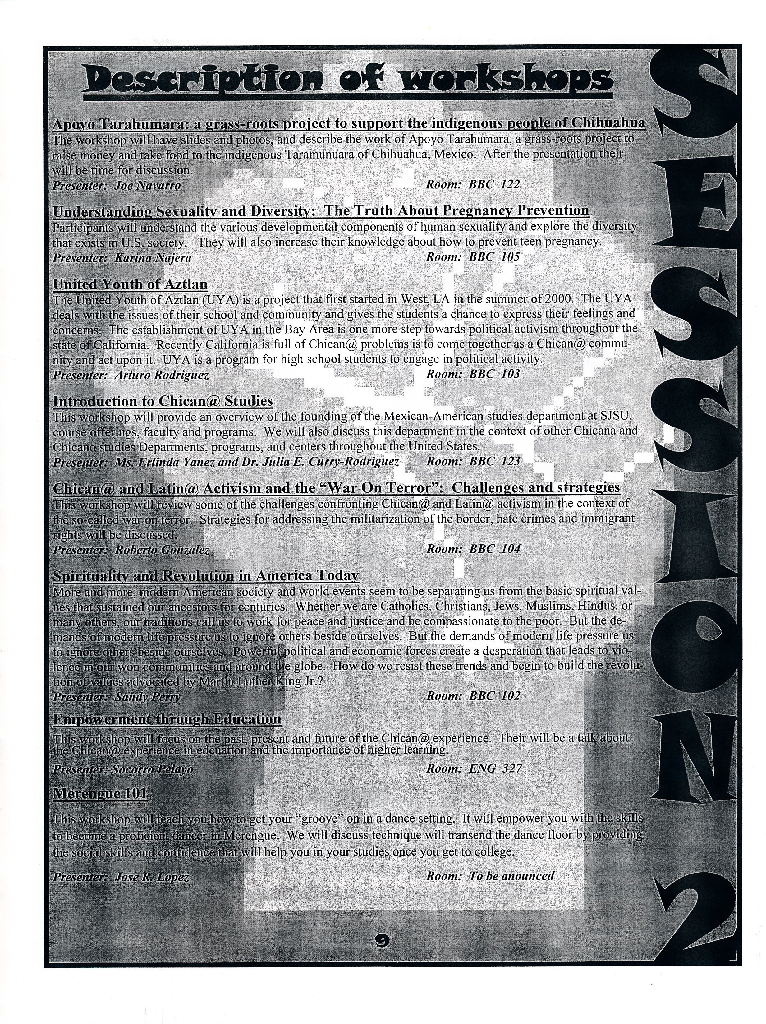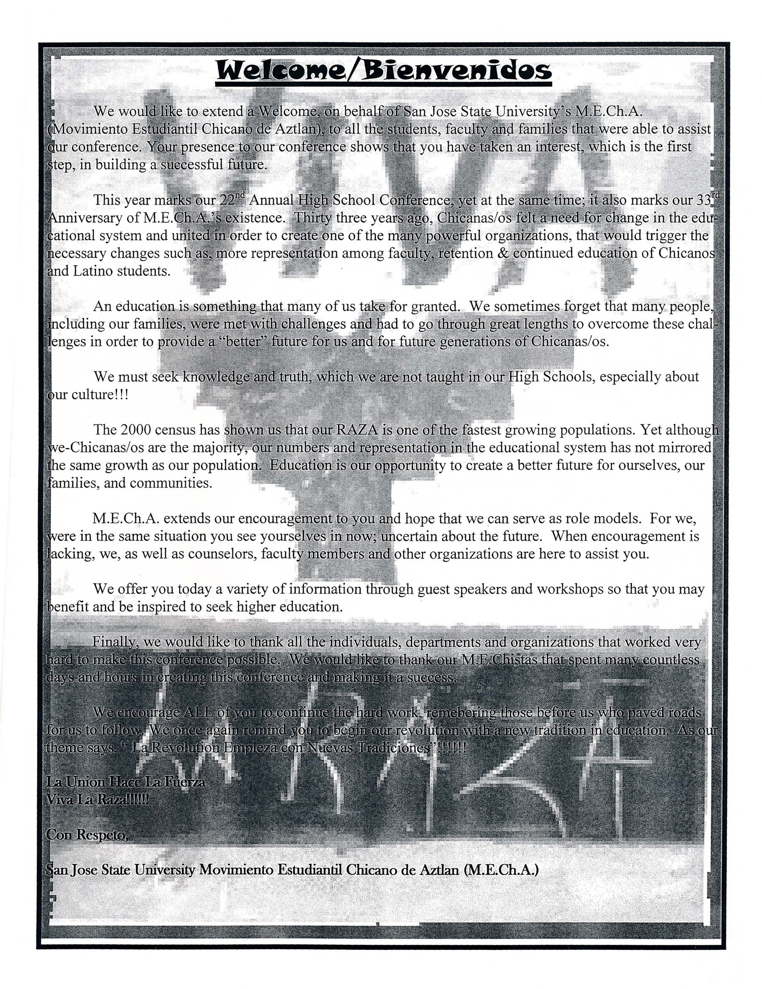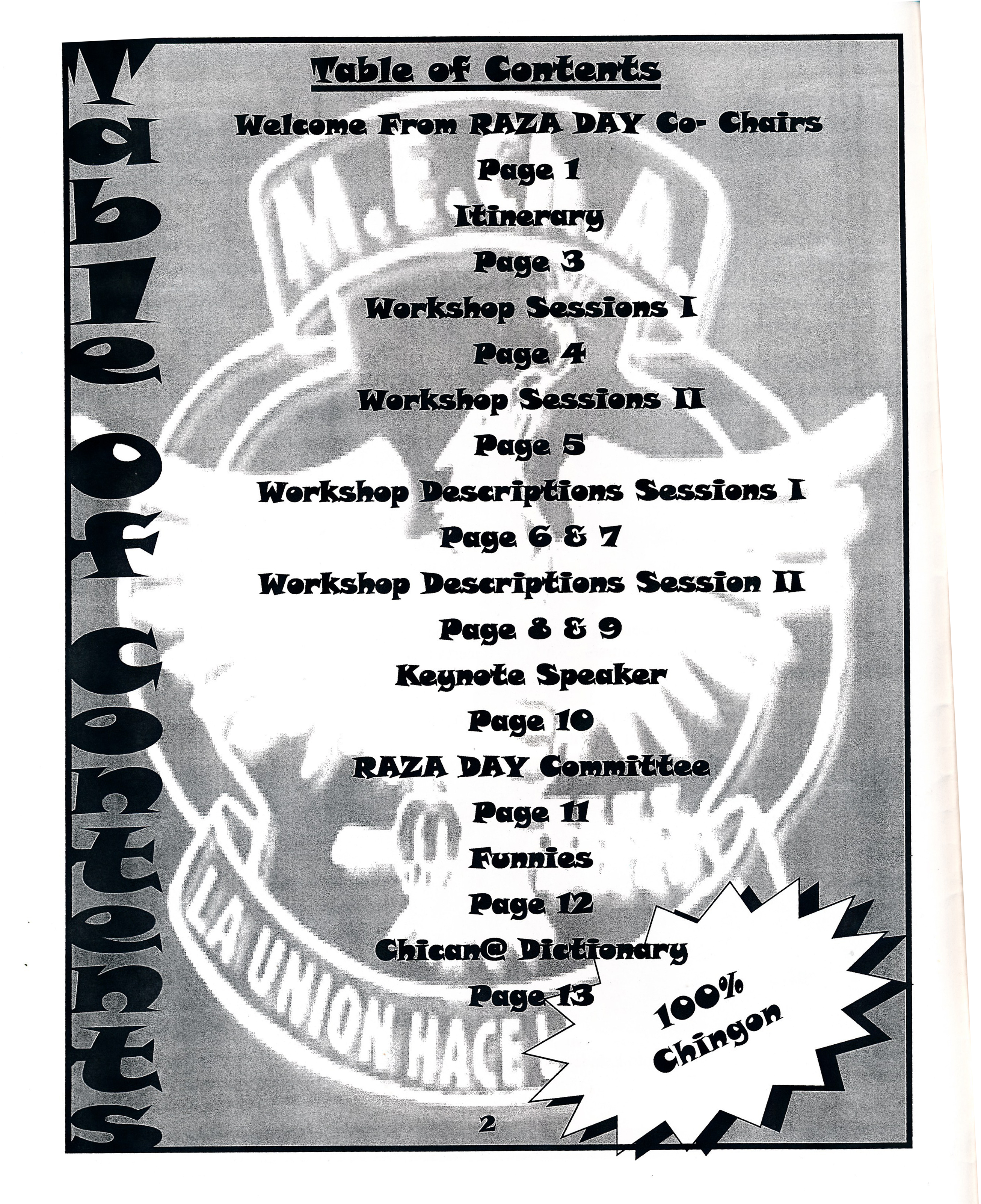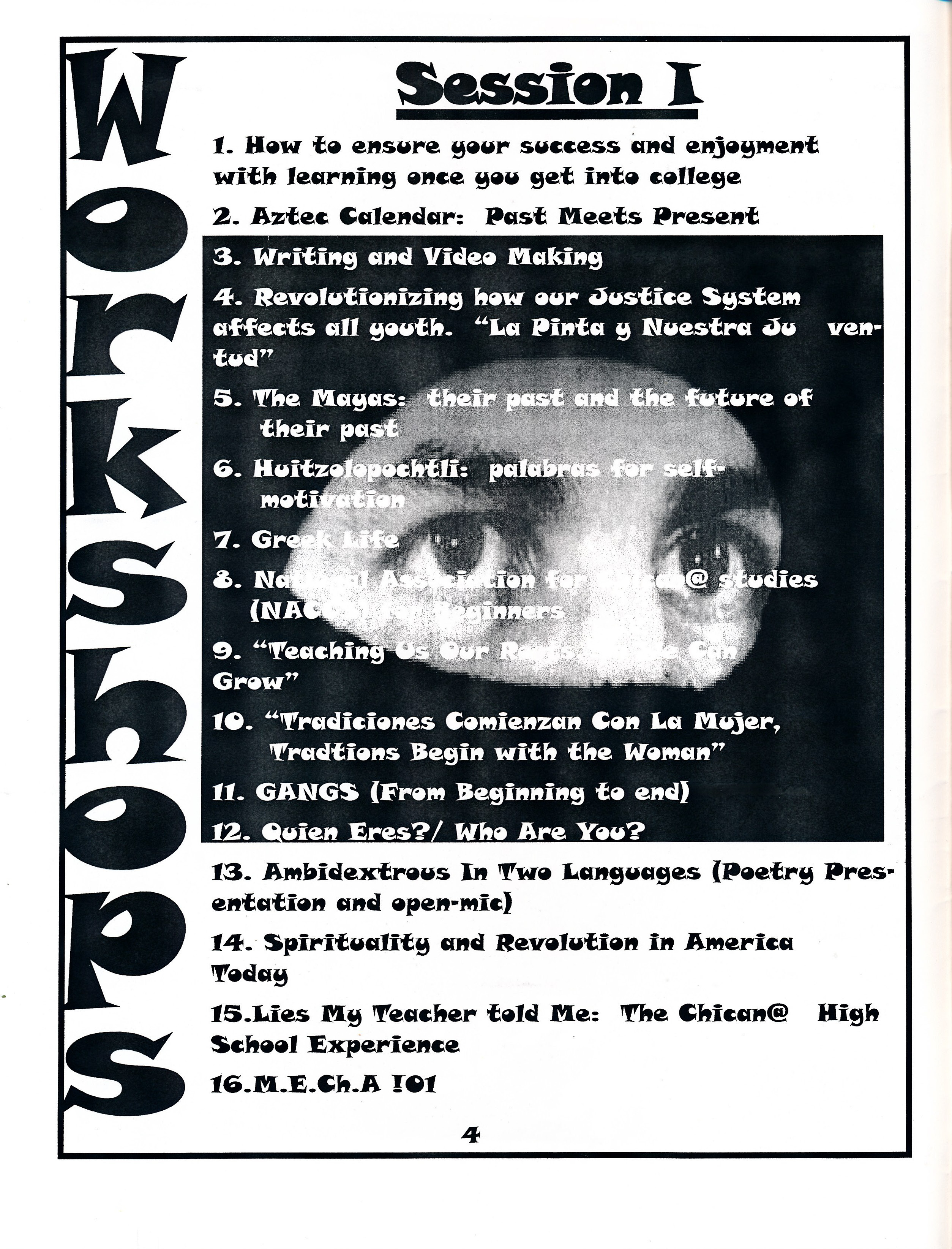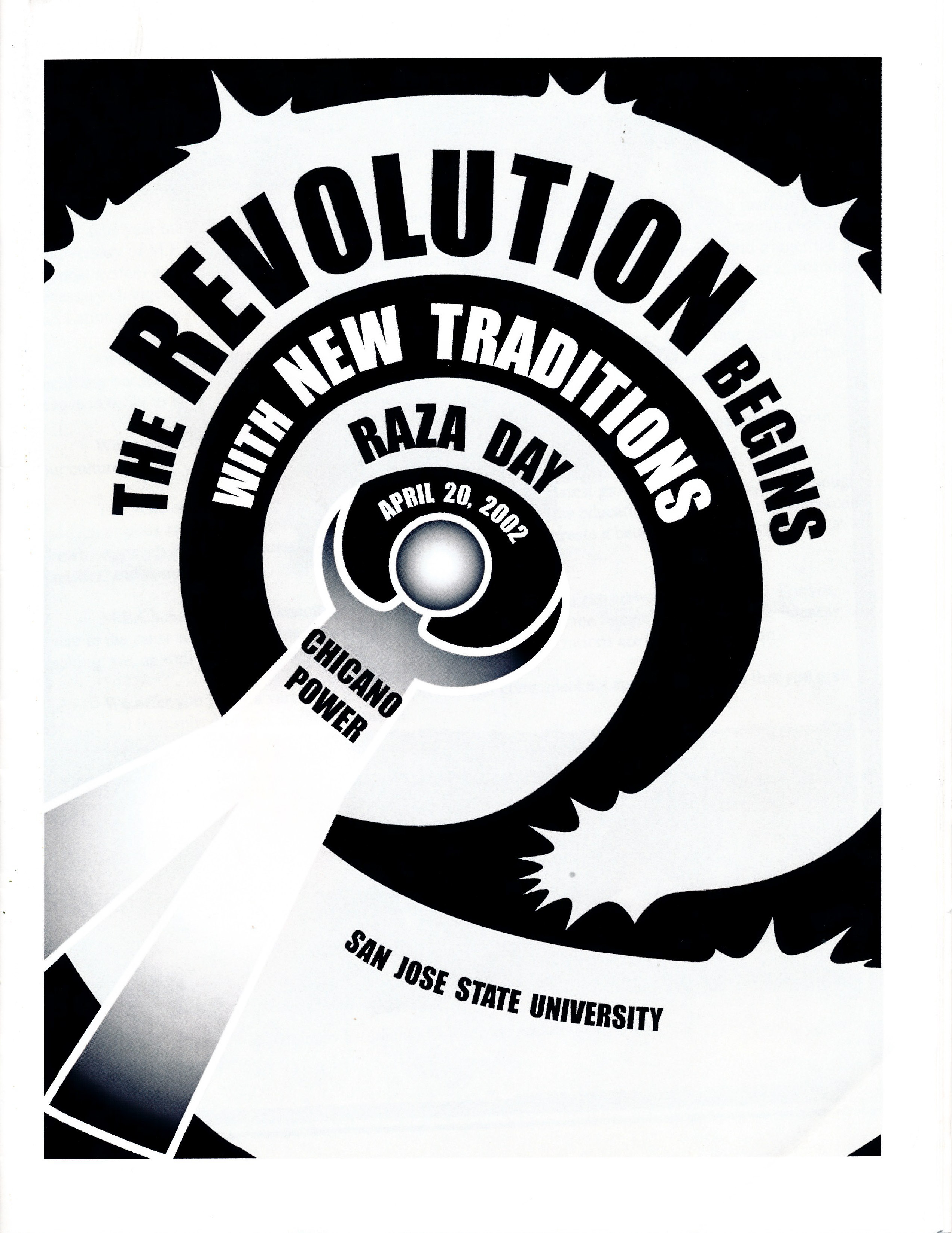 Program for Raza Day, presented by SJSU Movimiento Estudiantil Chicano de Aztlán (M.E.Ch.A.). Held on Wednesday, April 20, 2002 at San Jose State University. The event included Workshops, a College Fair, and Talking Circle.