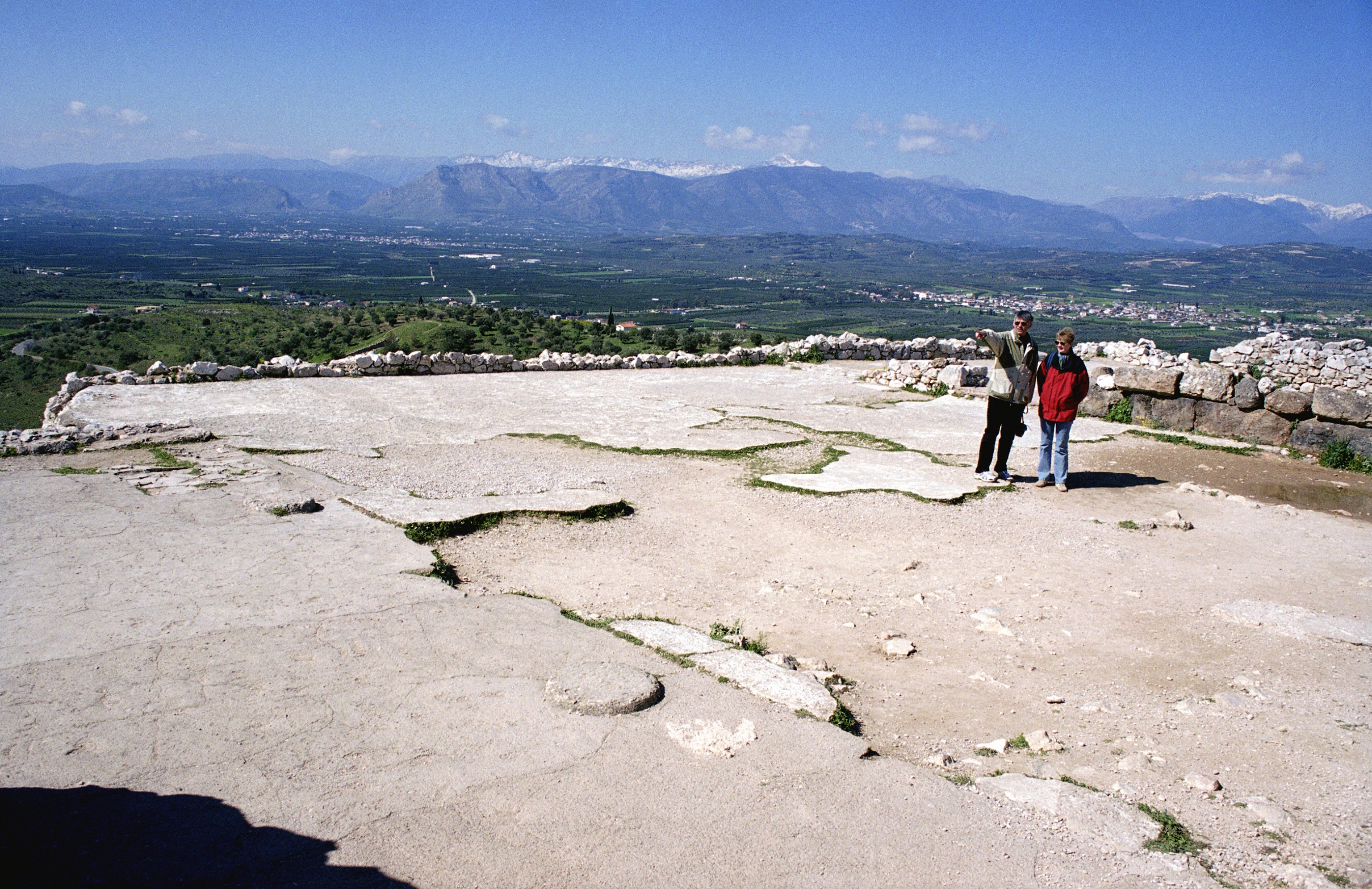 Palace portico, in foreground with column base, and courtyard, view SW to Plain of Argos