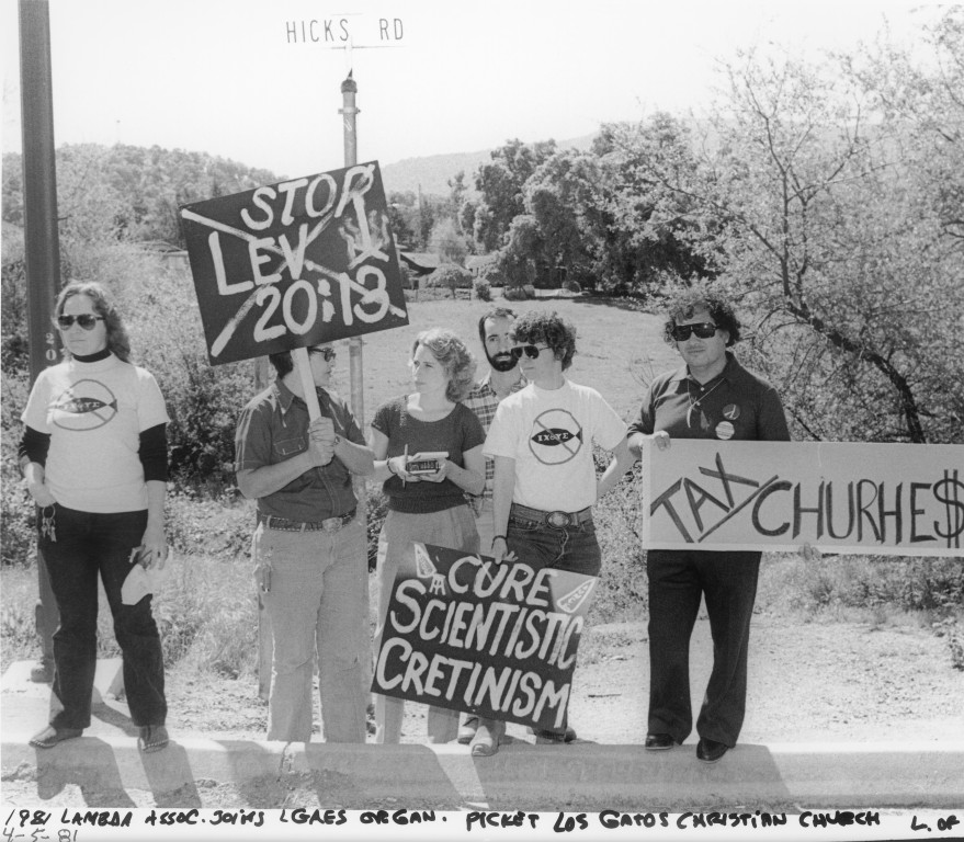 Photographs shows members of the Lesbian and Gay Association of Engineers and Scientists (LGAES) and supporters picketing the Los Gatos Christian Church. Demonstrators hold signs that read, "Stop Lev. 20:13", "Curse Scientistic Cretinism", and "Tax churche$". Street sign reads, "Hicks Rd".