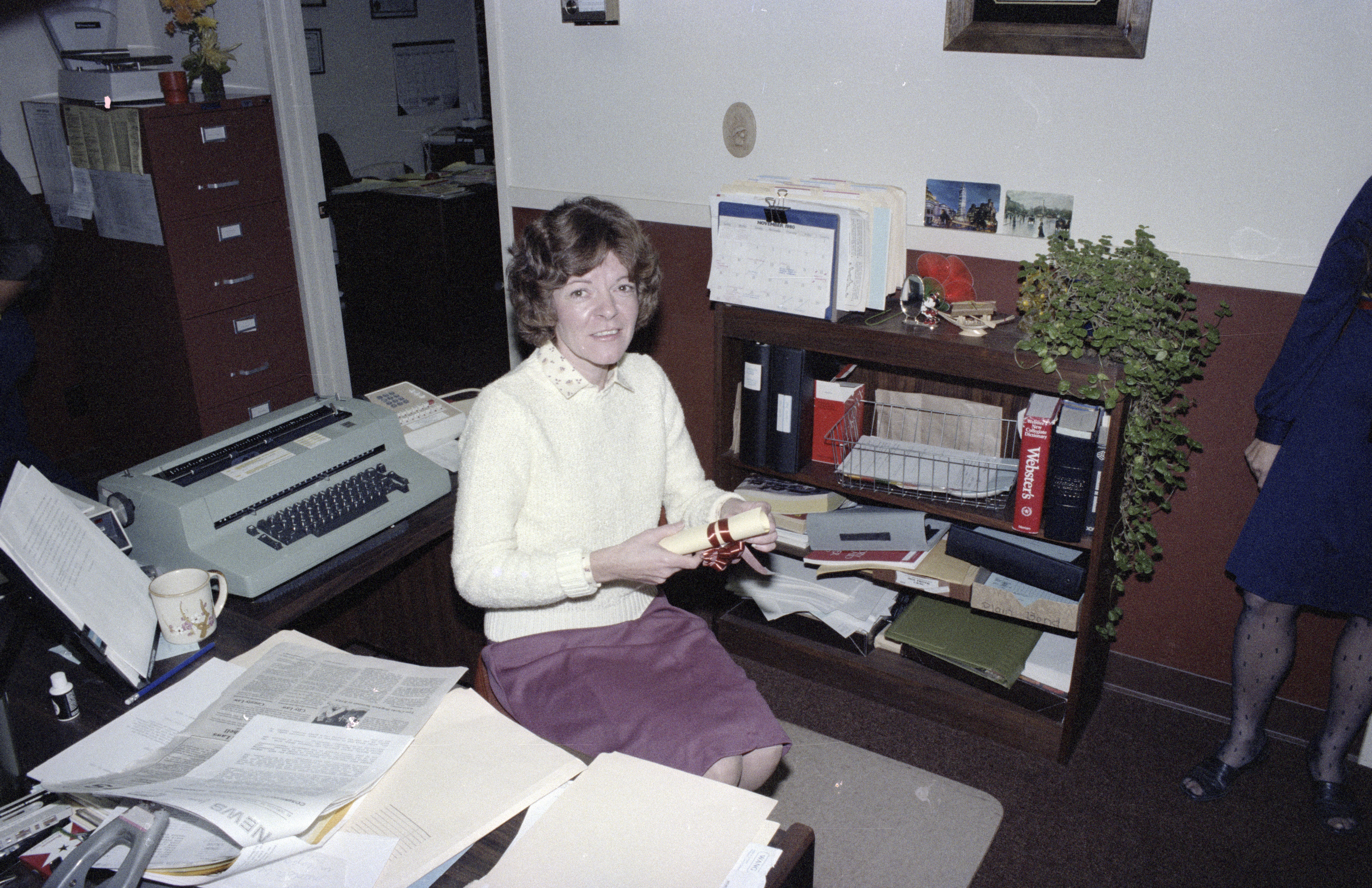 Doris Burnes seated at secretarial desk Selectric typewriter, white out bottle, bookshelf, two-hole punch