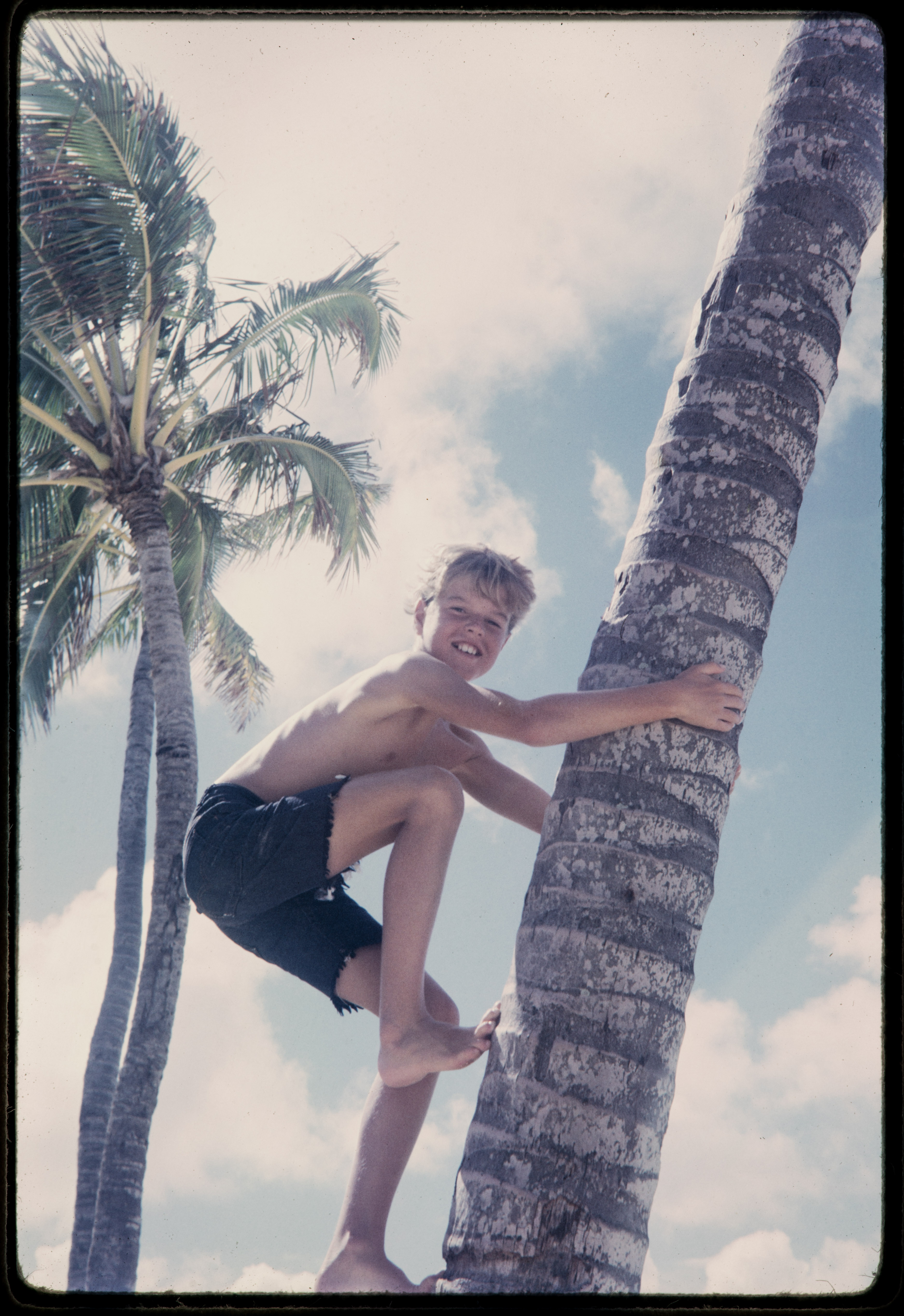 Joel scales a coco palm on an Oahu beach