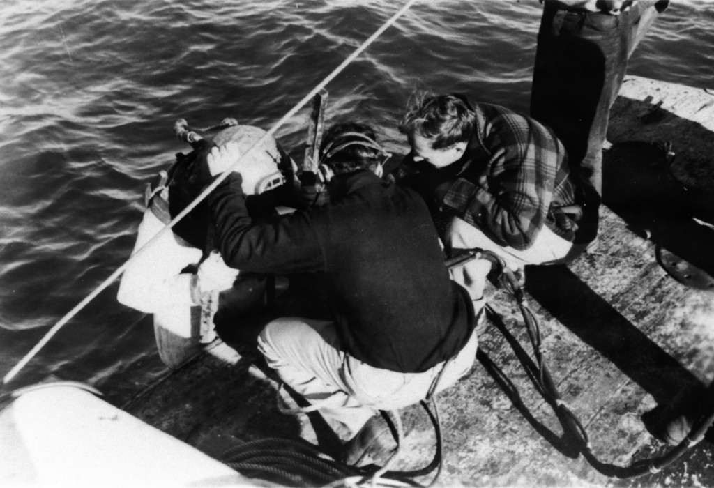 William Alston Ritchie Lovejoy in diving suit. Photograph is for a Monterey Herald story. Original in safe