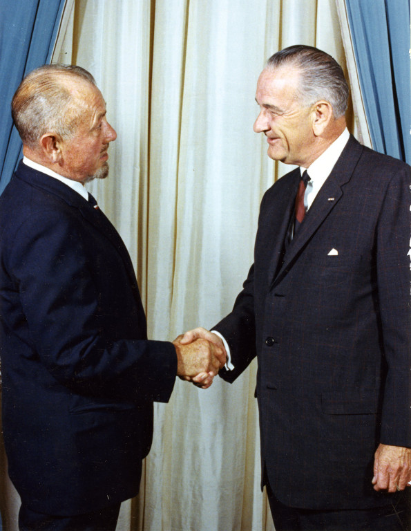 John Steinbeck shakes hands with President Lyndon Baines Johnson (LBJ) at Medal of Freedom ceremony, which Steinbeck recieved in 1964. Original in safe