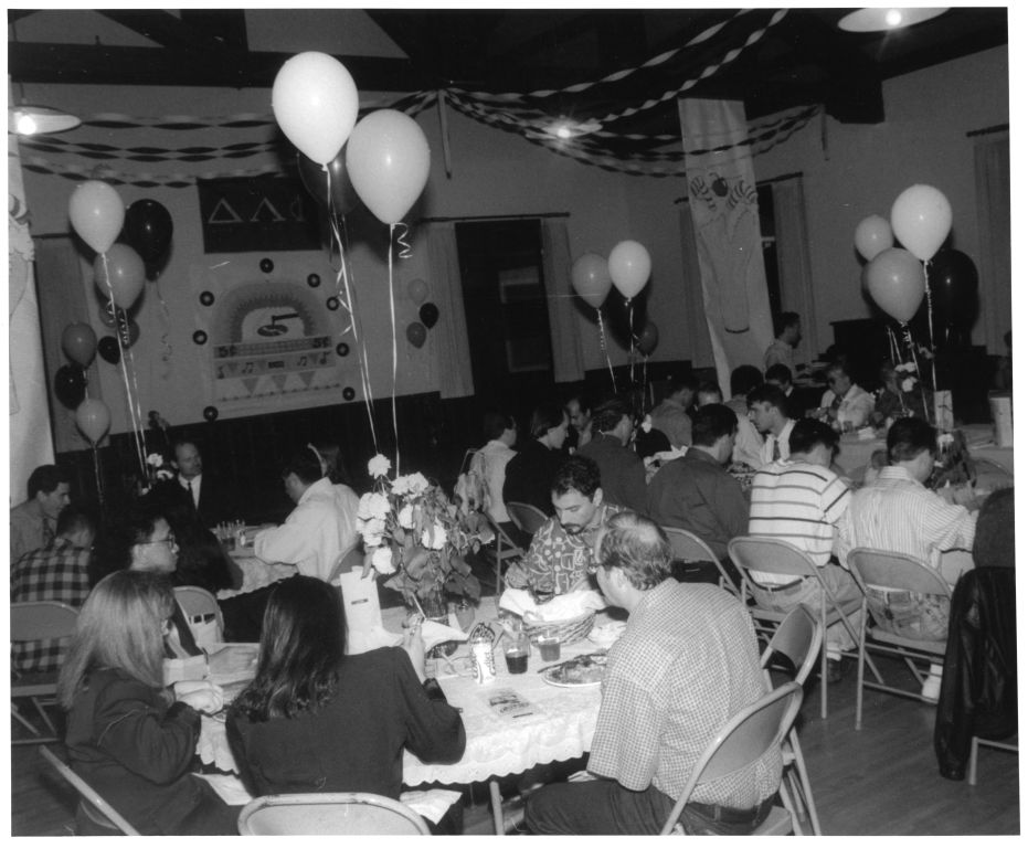 People eat at an unidentified event in a large hall decorated with balloons and streamers. A banner in the background indicates it may be a Lambda Assocation event.