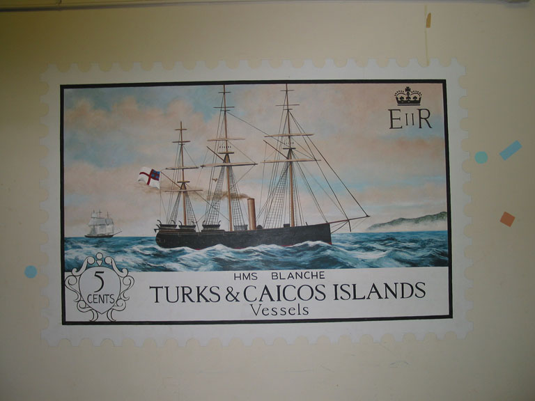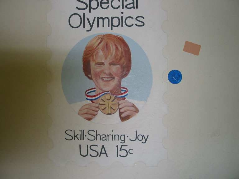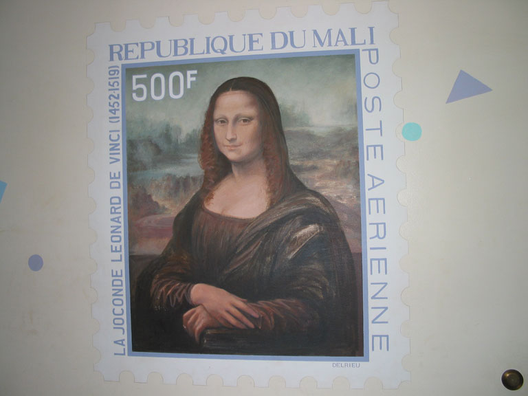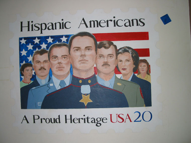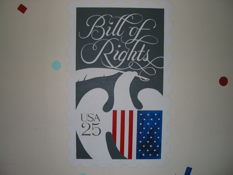 Series of murals of stamps: Turks and Caicos, the Special Olympics, the Mona Lisa, Hispanic Americans, First Man on the Moon, and the Bill of Rights.
