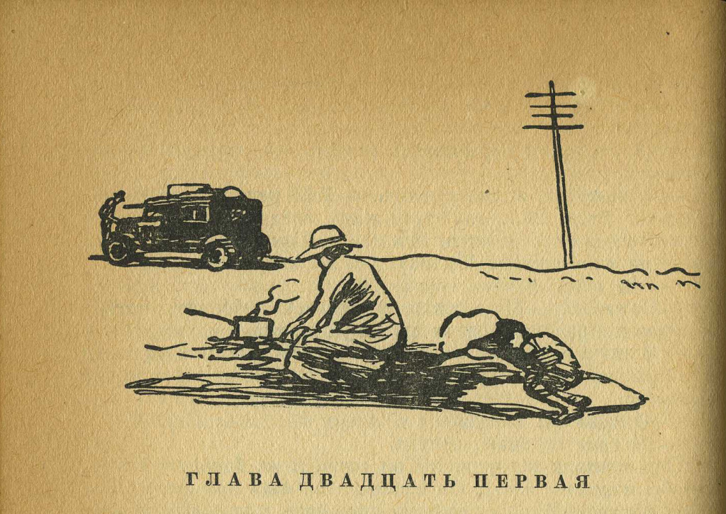 Glava Dvadtsat Pervaya' (Chapter 21). Woman cooking at a fire, a man and car in background and a child lying next to a woman. Pen and ink lithograph. Lev Grigorevich Brodaty was born in Warsaw in 1889. A graphic artist, poster artist and illustrator, he created these for a Russian translation (possibly the first) of The Grapes of Wrath. He died in Moscow in 1954.