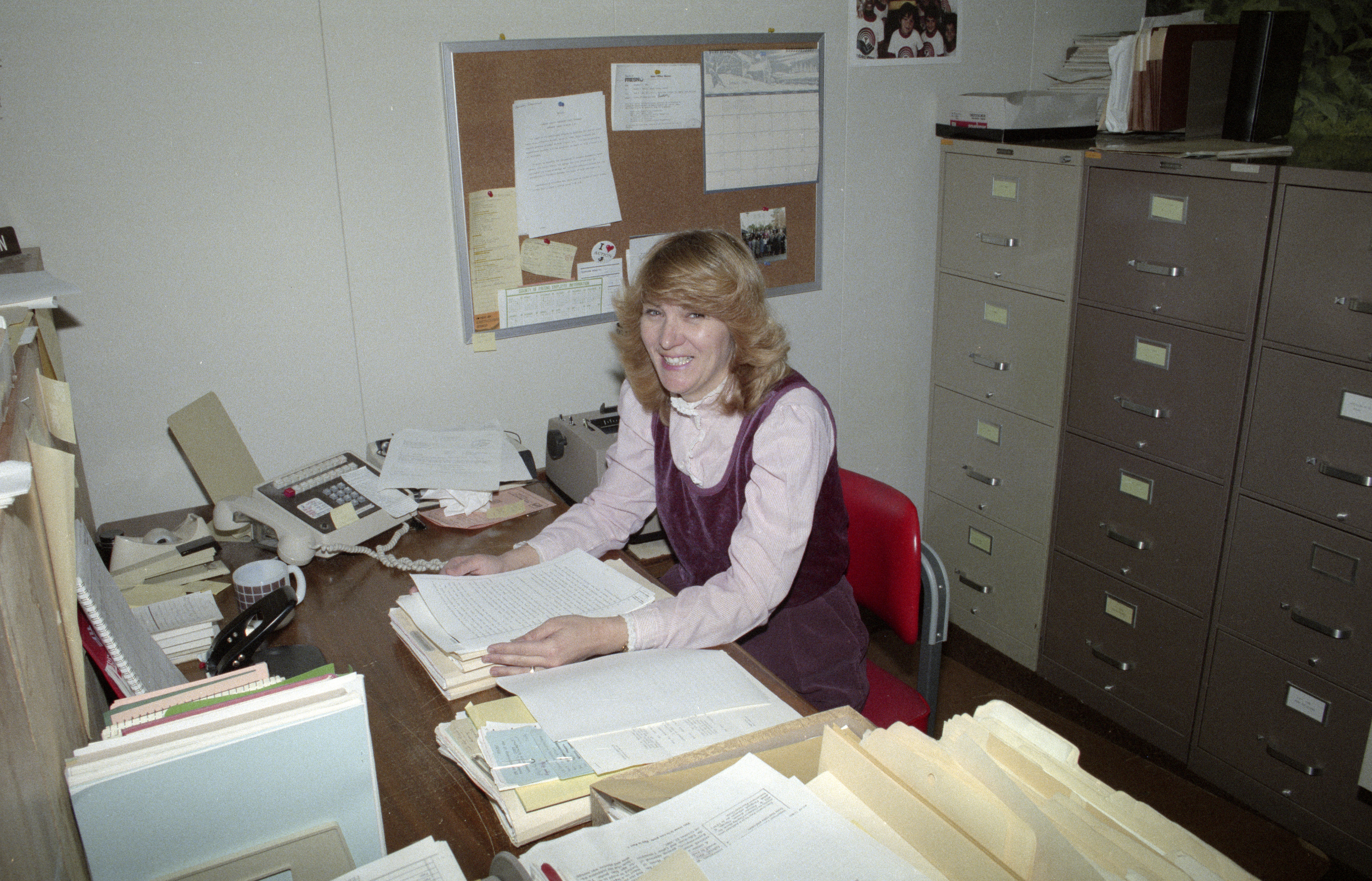Secretary at desk working on file; corded office phone and vertical file holders on desk Cork board on wall; filing cabinets in background
