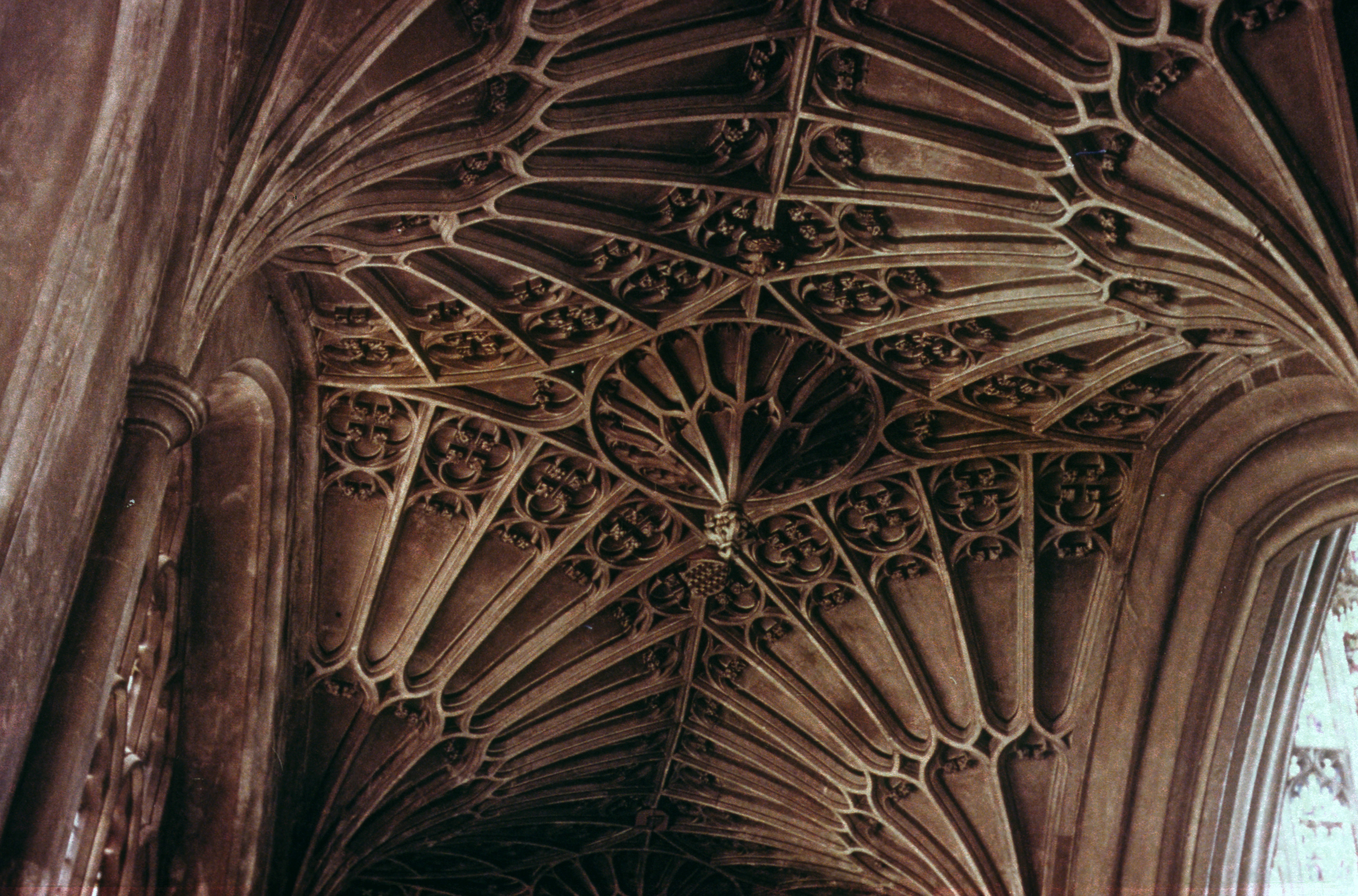 The aisle vaulting at Bath Abbey presents a further advance in that the space where the fans meet is filled with a pendant. This gives a similar structural effect to that thrusts. Spans up to fifty feet could be panel sections of great strength and lightness and under the Tudors, the system was exploited to become a highly spectacular event.
