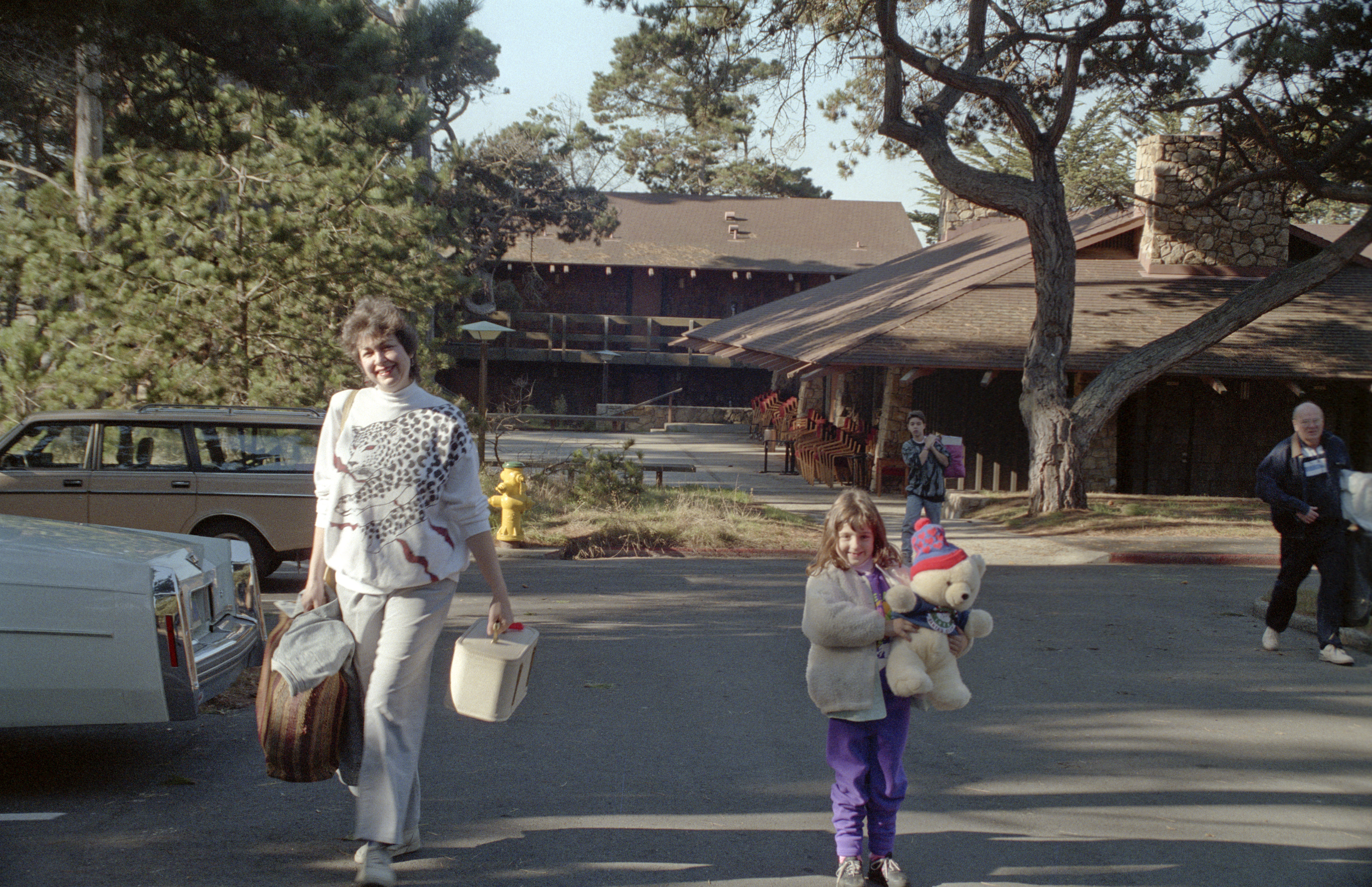 Christine Watkins carrying suitcase and vanity and Robin Watkins carrying her birthday teddy bear as they leave Asilomar Hotel