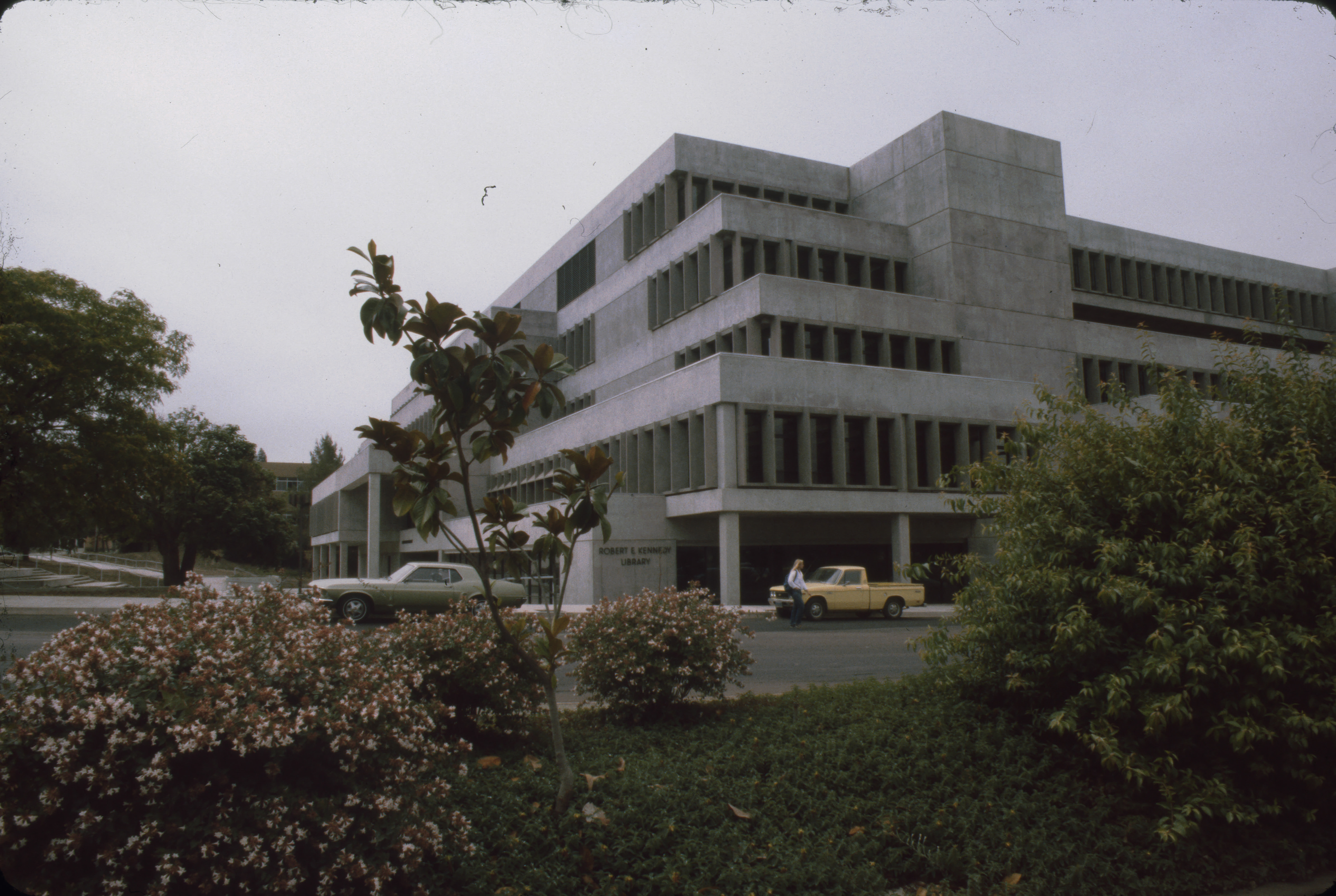Finished construction of Kennedy Library, facing southeast. The "Robert E. Kennedy Library" name plate is visible. Also, period cars and a pedestrian are visible on the street next to the building.