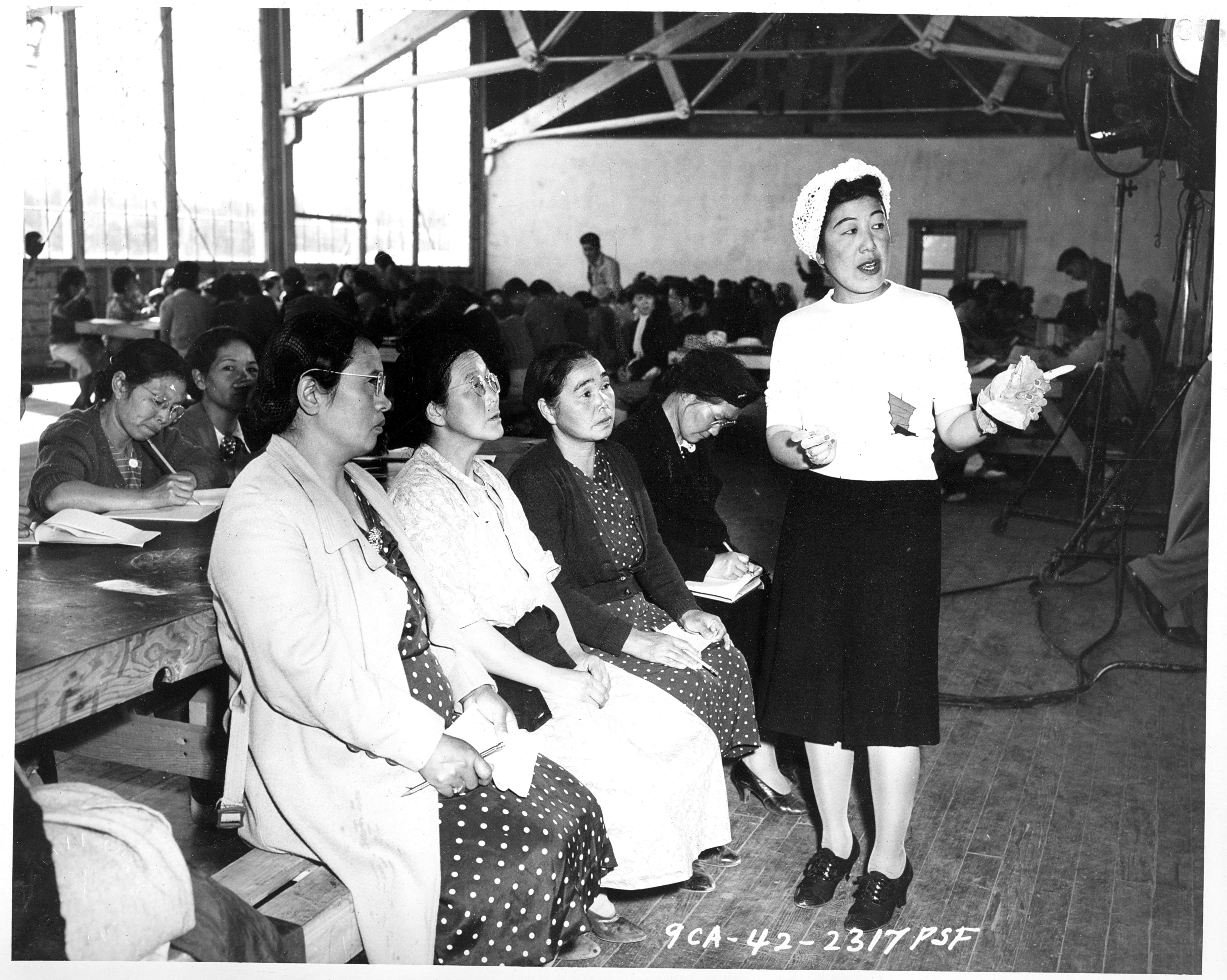 Photograph shows a Japanese teacher instructing a group of adults at Tanforan Assembly Center in San Bruno, California.