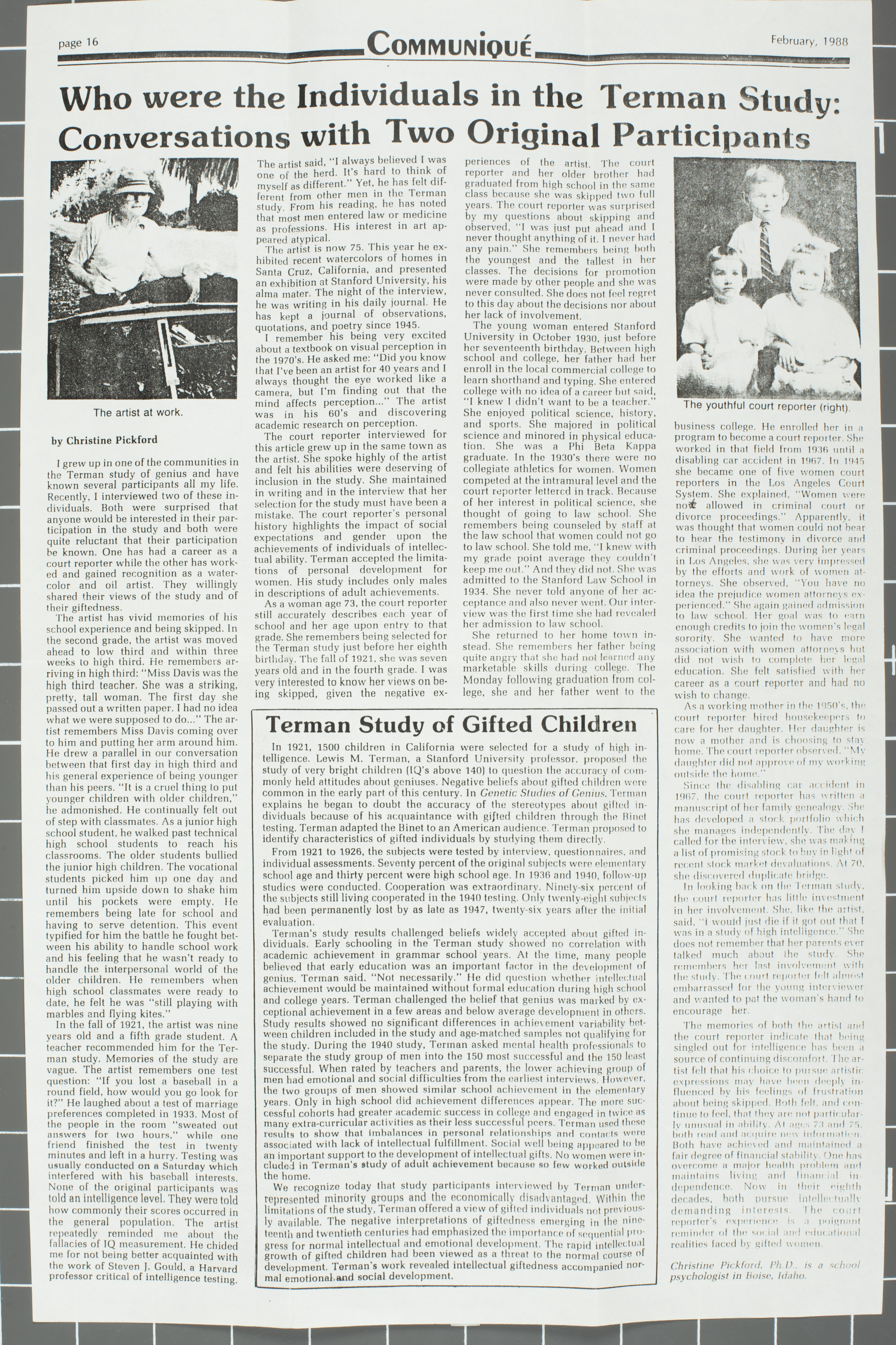 Interviews with Rollin Pickford and one other Terman Study participant published in a newsletter for the National Association of School Psychologists. Both interview subjects are presented anonymously; Pickford is referred to as "the artist."