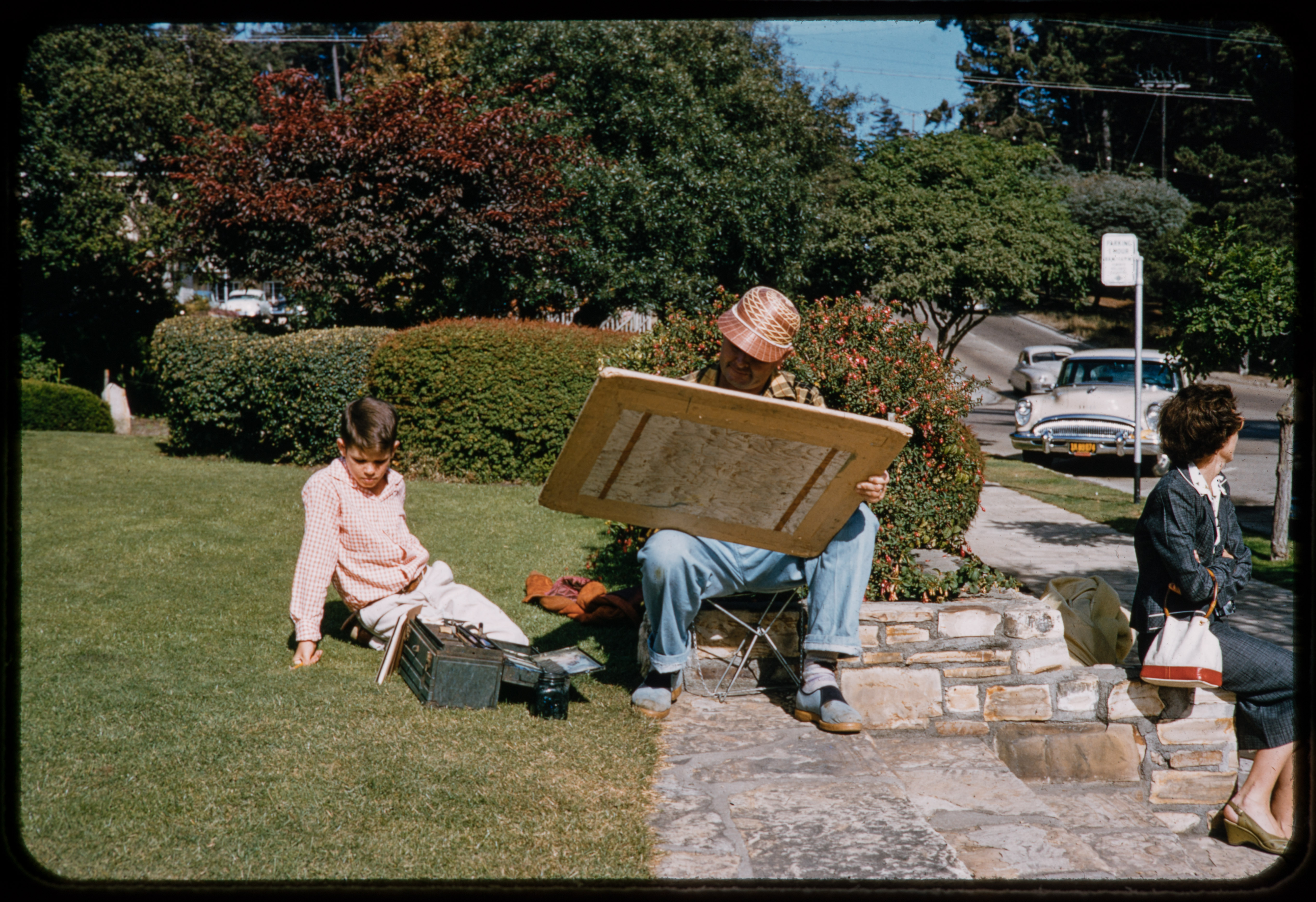 Rollin paints in Devendorf Park, Carmel-By-The-Sea, accompanied by his son Jim.