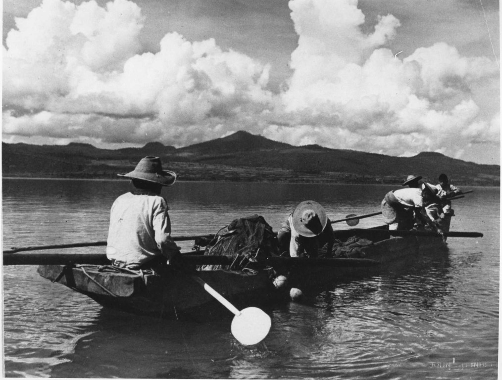 Native Mexicans in dugout boat, preparing to throw out nets. See also number 106. Original is in the safe.