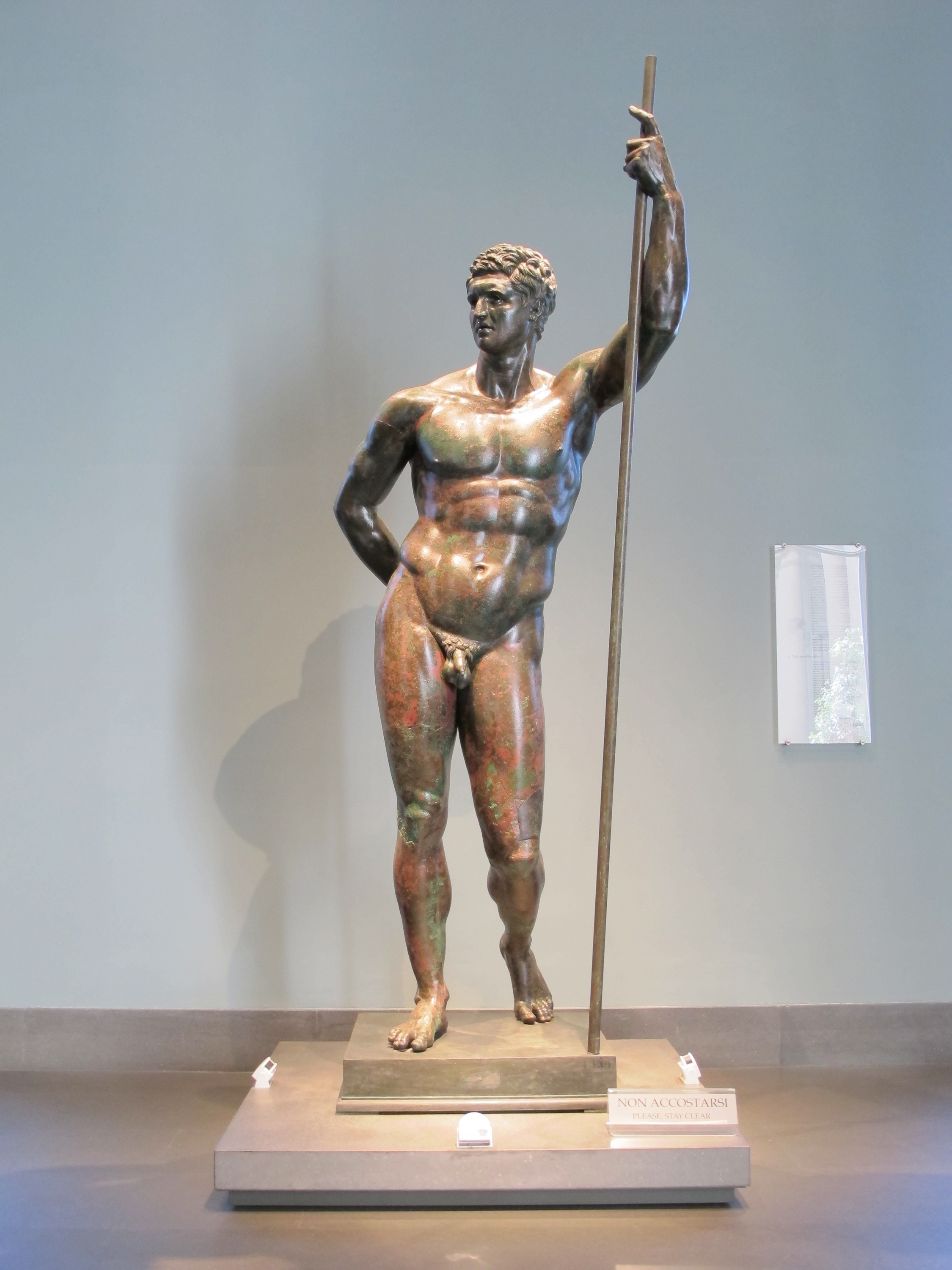 Derives from famous statue by Lysippus of Alexander the Great. Possibly a representation of Attalus II, king of Pergamon, or a Roman wishing to be represented as an Hellenistic prince. Shaft is a modern replica of original spear.