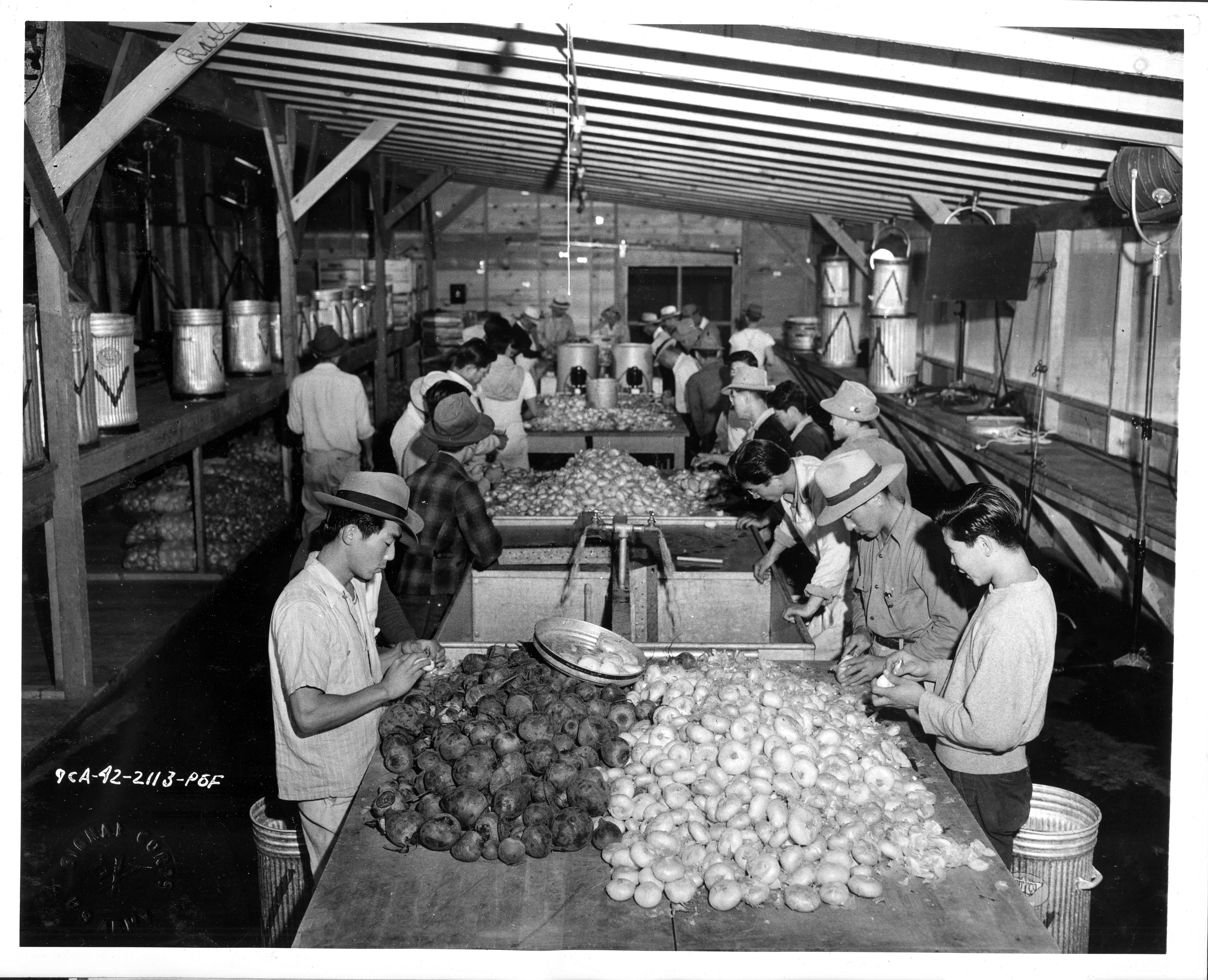 Photograph shows evacuee workers at the Santa Anita, California Assembly Center preparing onion, beets, turnips and other vegetables for cooking.
