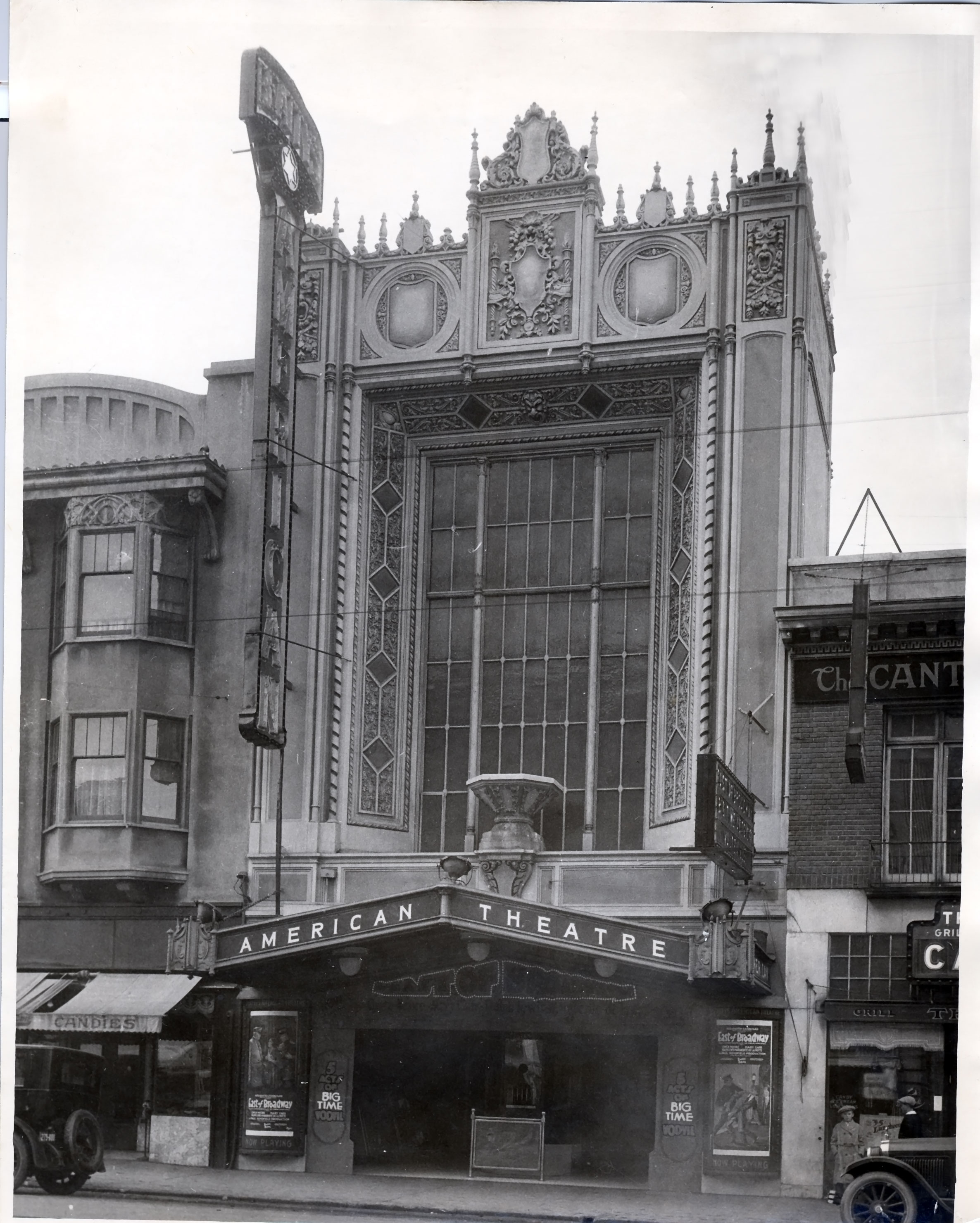 American Theatre, also known as Beatty's American Theatre. Movie playing is "East of Broadway", starring Owen Moore, a silent movie actor and first husband of Mary Pickford. This theater was originally designed in a Spanish Gothic hybrid style in a collaboration of local architects Binder & Curtis with San Francisco architects Charles Peter Weeks & William Day.