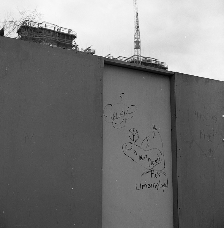 View of grafitti on a wall. There is a monkey face drawing, an upside down peace sign, two stick figures and a quote that reads: God is not dead. He's unemployed.
