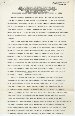 City of Oxnard Statement Regarding the Ventura County Community College District's "2000 A.D. Educational Master Plan" and "Ten Year Facilities Plan"