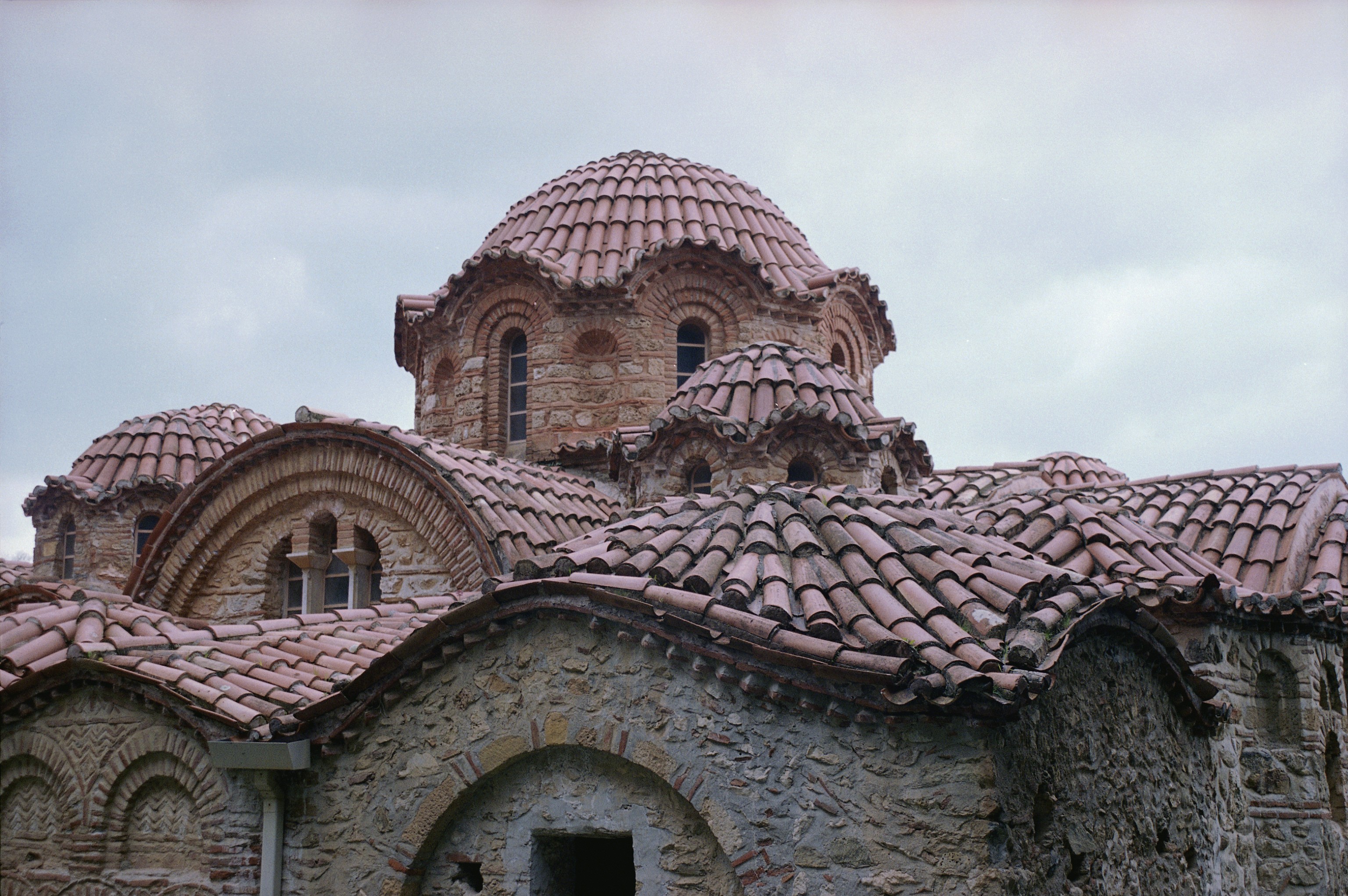 Closer view of tiled roofs: saw-tooth bands underlining eaves, scalloped rooflines of drums