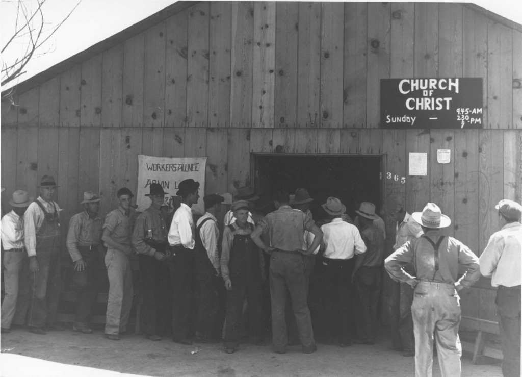 Migrant workers in line to collect State Relief Pay. Signs on barn say: 'Church of Christ, Sunday 9:45am, 2:30 & 7pm" and 'Workers Alliance Arvin Local.' See also number 0-482.