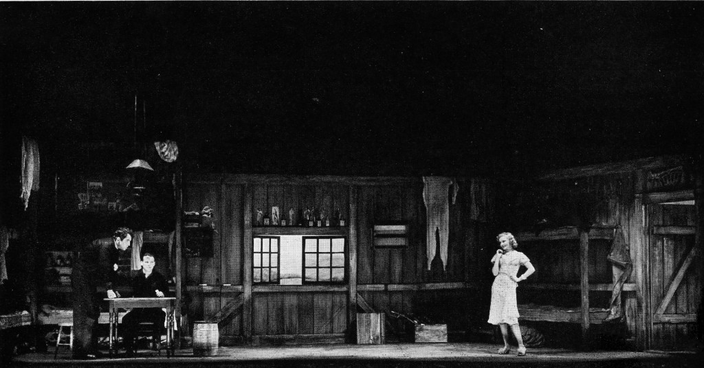 George (Wallace Ford), Lennie (Broderick Crawford) and Curley's wife (Clare Luce) in John Steinbeck's 'Of Mice and Men,' on the 'Bunkroom Stage' of an unidentified theater in New York.
