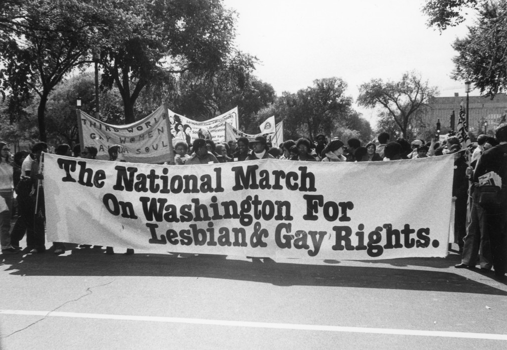 Photograph shows a banner being held by marchers that reads, "The National March on Washington for Lesbian & Gay Rights".