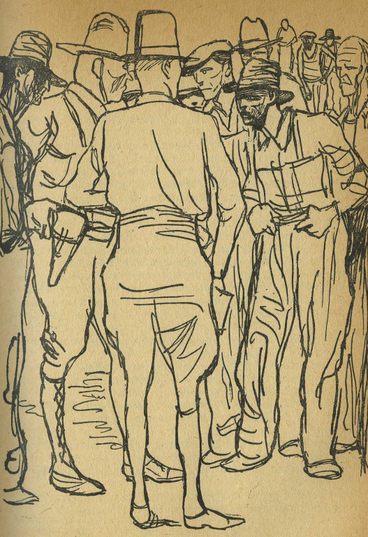The contractor and deputy sheriff 'Joe' confront Floyd Knowles for speaking up about the contractor's lack of a license to hire. Pen and ink lithograph. Lev Grigorevich Brodaty was born in Warsaw in 1889. A graphic artist, poster artist and illustrator, he created these for a Russian translation (possibly the first) of The Grapes of Wrath. He died in Moscow in 1954.