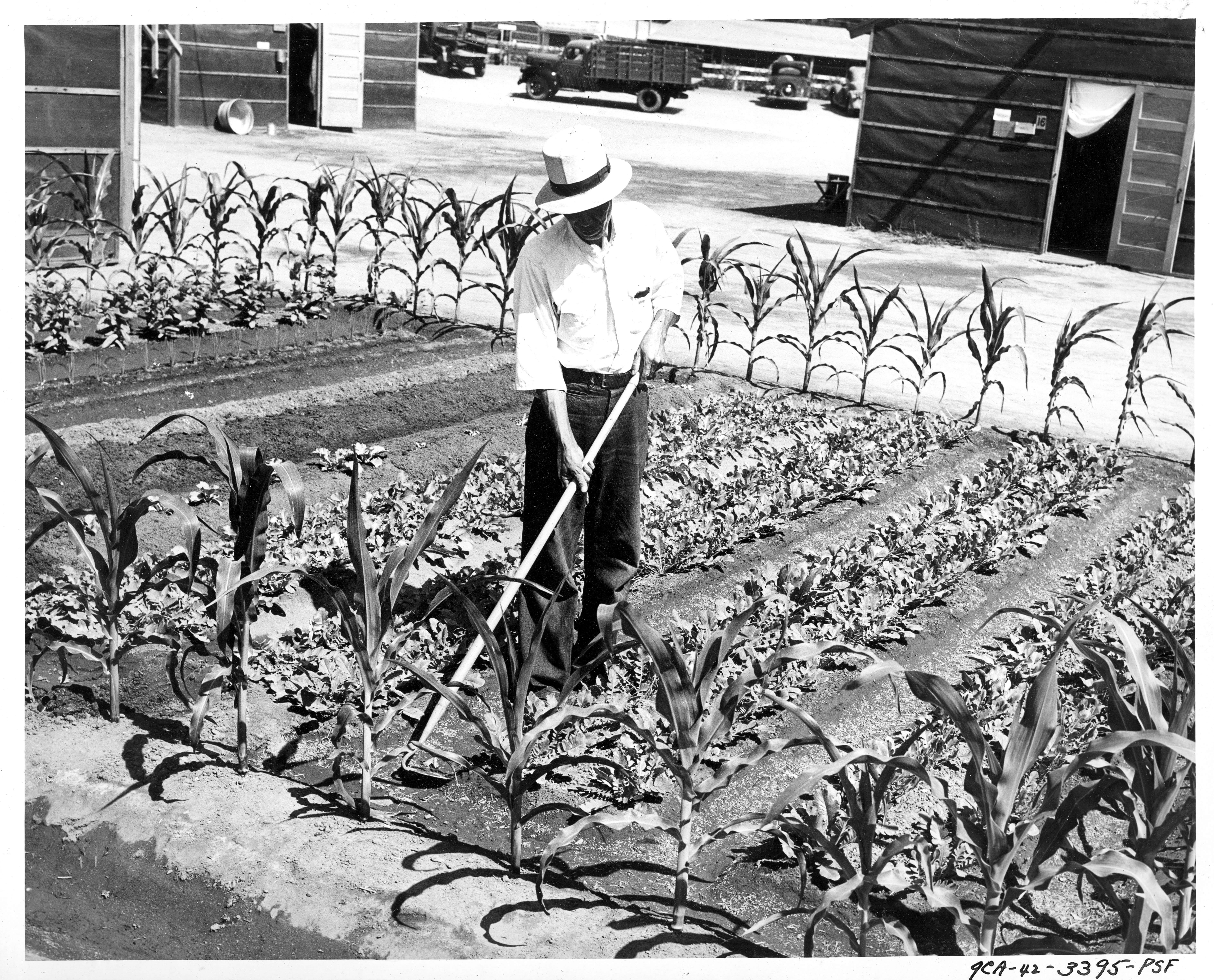 Photograph shows a male evacuee hoeing in his garden at Fresno, California Assembly Center.