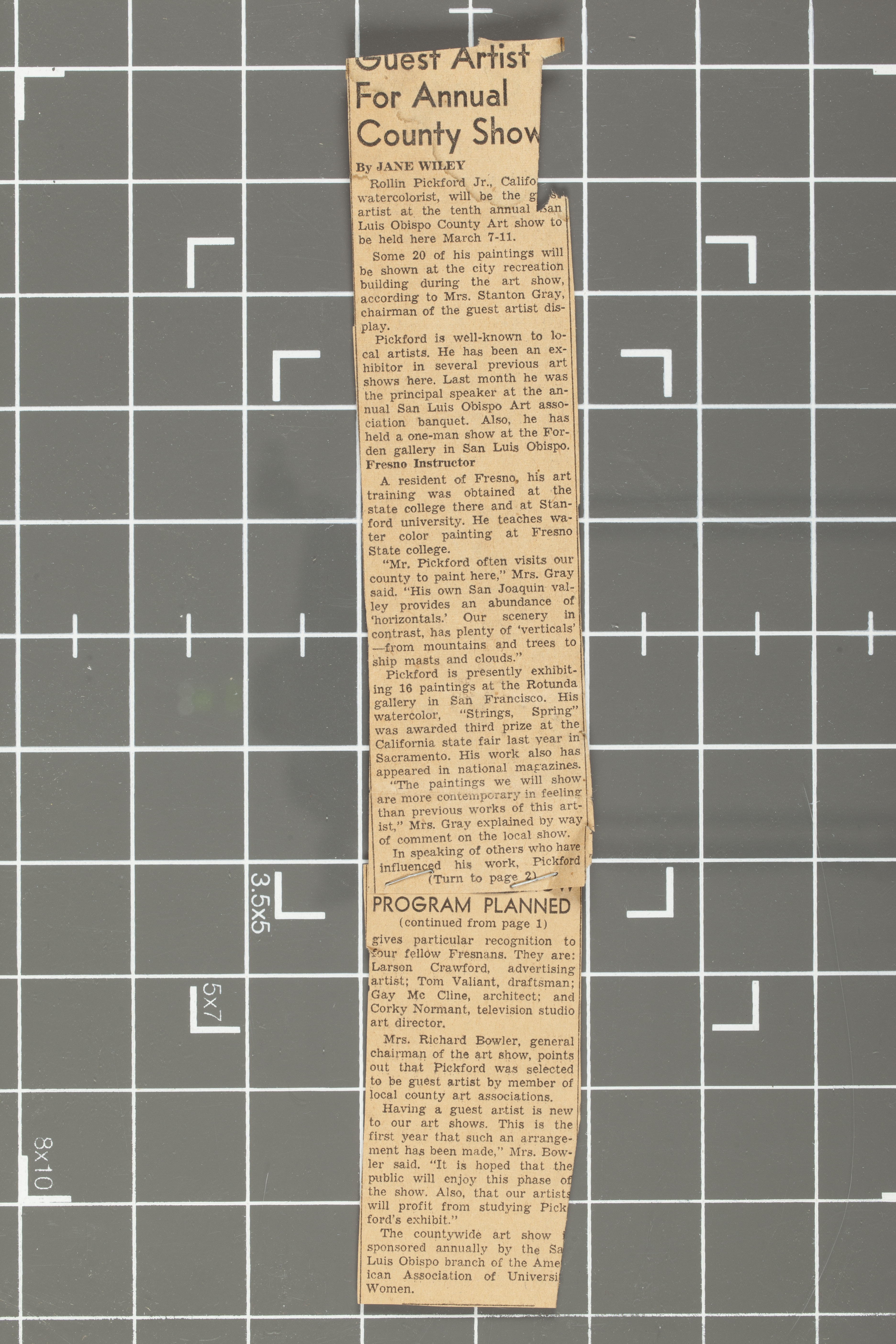 Article about Rollin Pickford as guest artist in an upcoming San Luis Obispo exhibition including a lecture and demonstration.