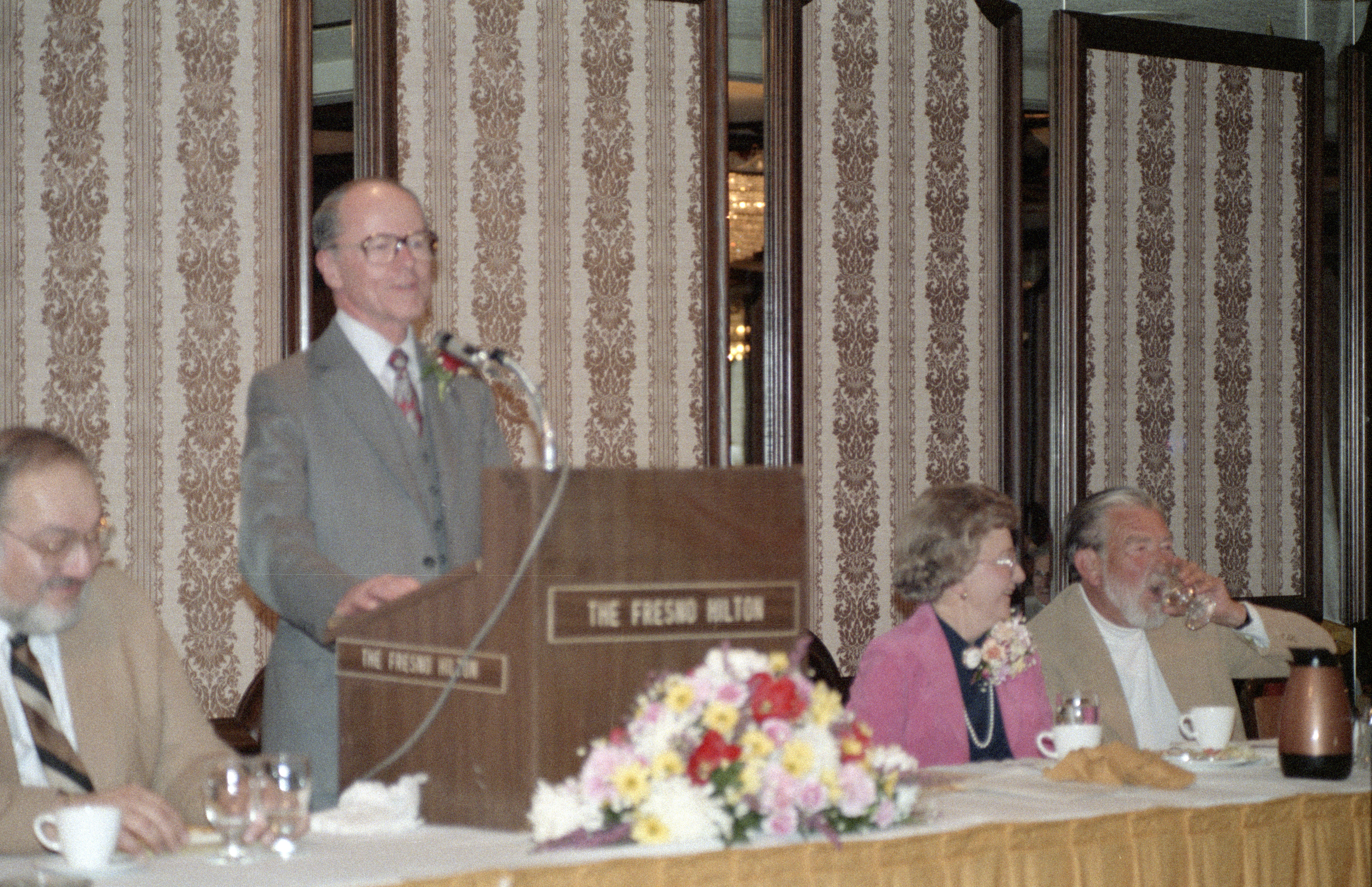Judge Blaine Pettitt wearing red rose boutonniere speaking at the lectern; Judge Robert Mardikian, Alice Pettitt and Judge Denver C. Peckinpah seated at head table