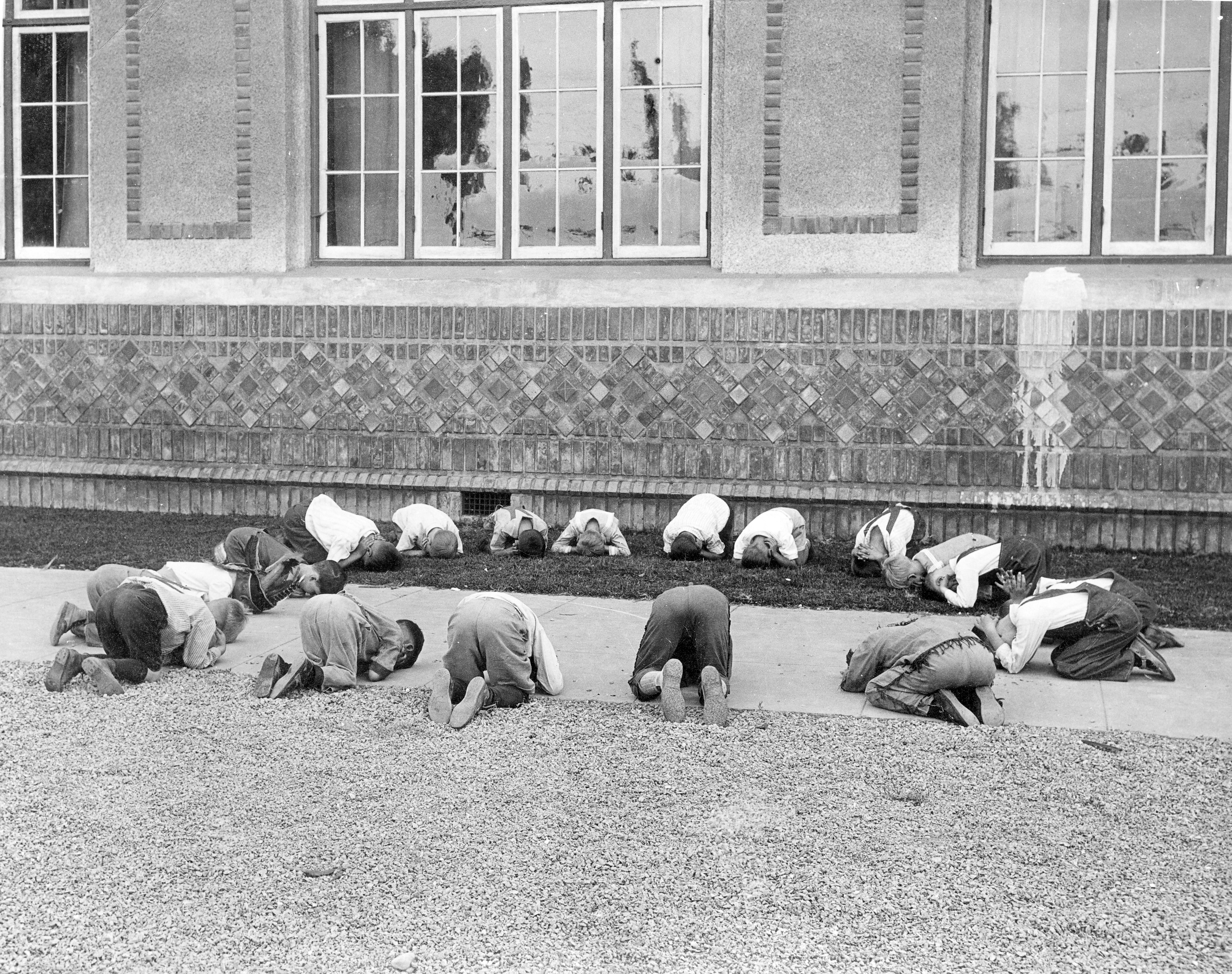 Children kneeling on the ground at San Jose State. Photograph shows seventeen boys in a circle kneeling on the floor with their heads on the ground. Some children have their hands on the back of their heads, on top of their heads or on the ground underneath their face.