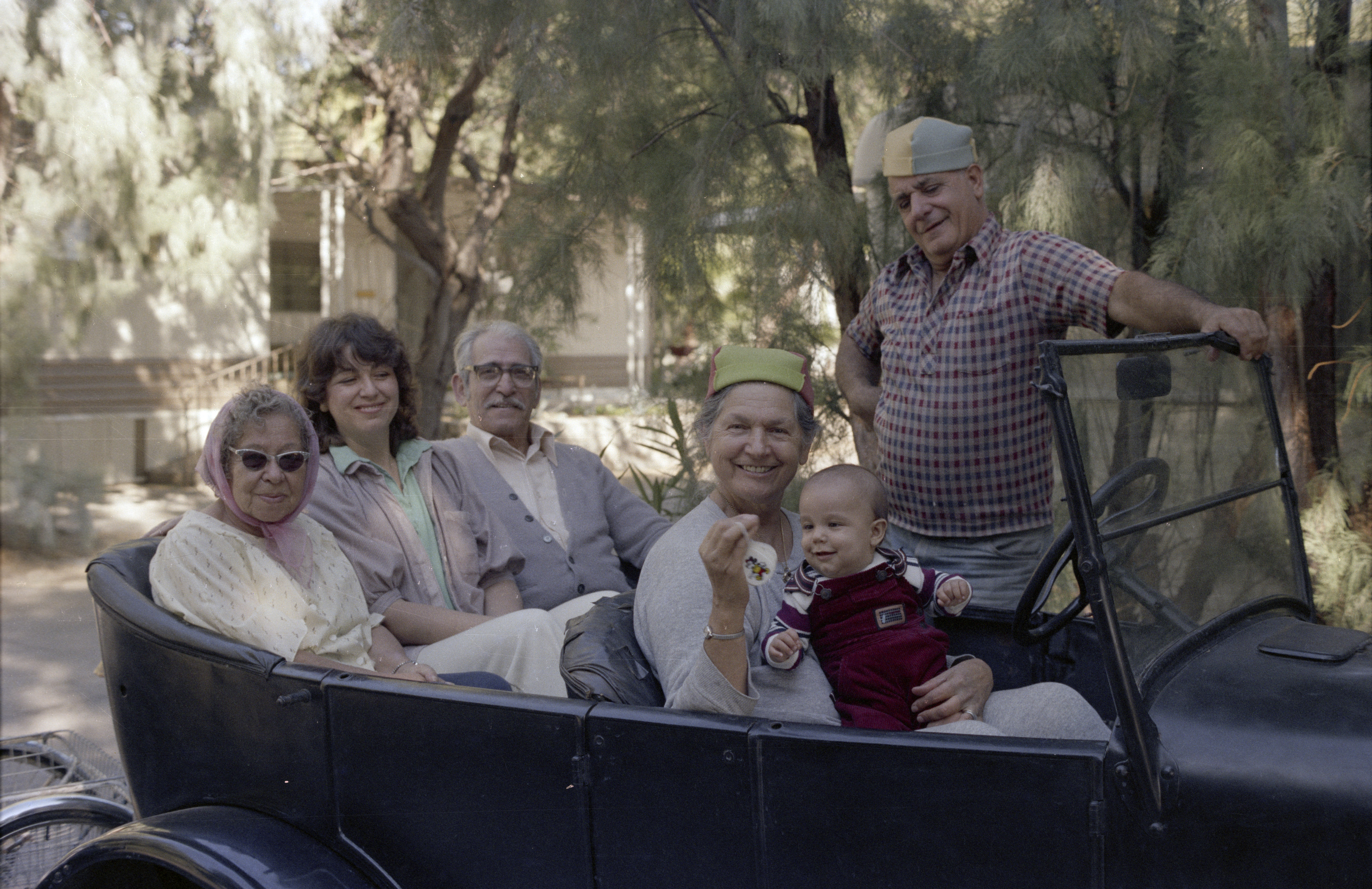 Bertha Krause, Christine Watkins, Manny Krause, Rose Watkins holding Adam Watkins, Albert Watkins in family 1926 Model T Ford Adam smiling