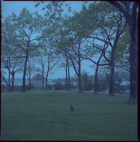 A view of Joyous Garde, Steinbeck's hexagonal writing room, which looked out over the cove near Bluff Point in Sag Harbor, New York. Color. Negative and digital copy only. No hard copy.