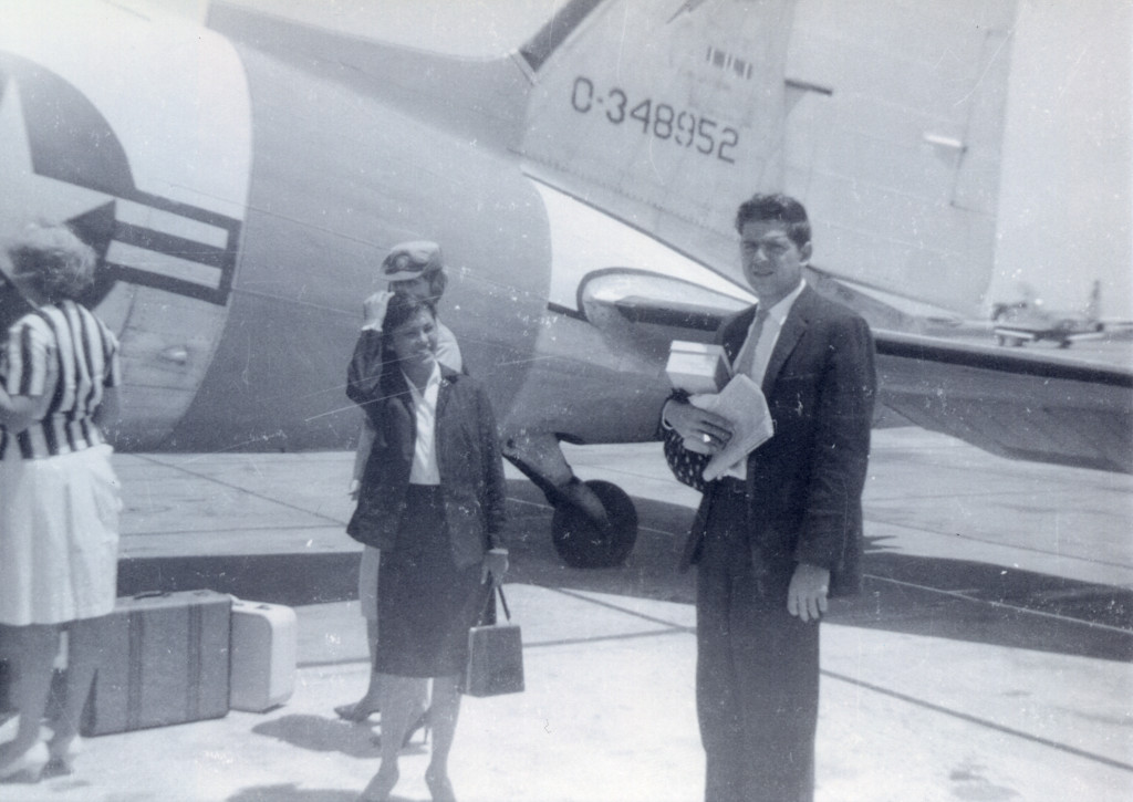 Patricia Whiting waits on the runway beside a United Service Organization (USO) airplane. She was traveling with an acting troupe.