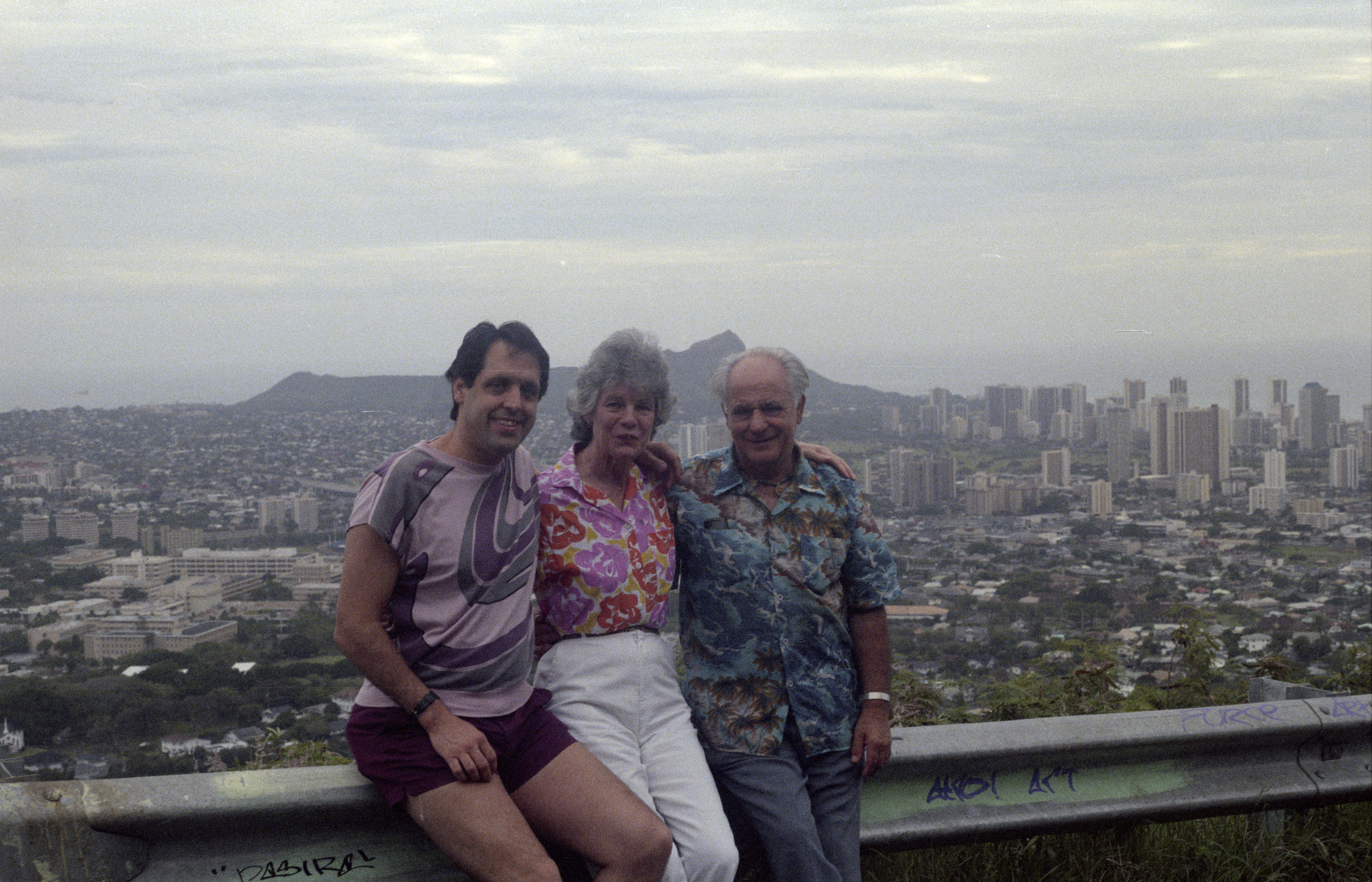 Howard Watkins, Rose O'Reilly and Albert Watkins with vista view of Diamond Head and Honolulu skyline in background