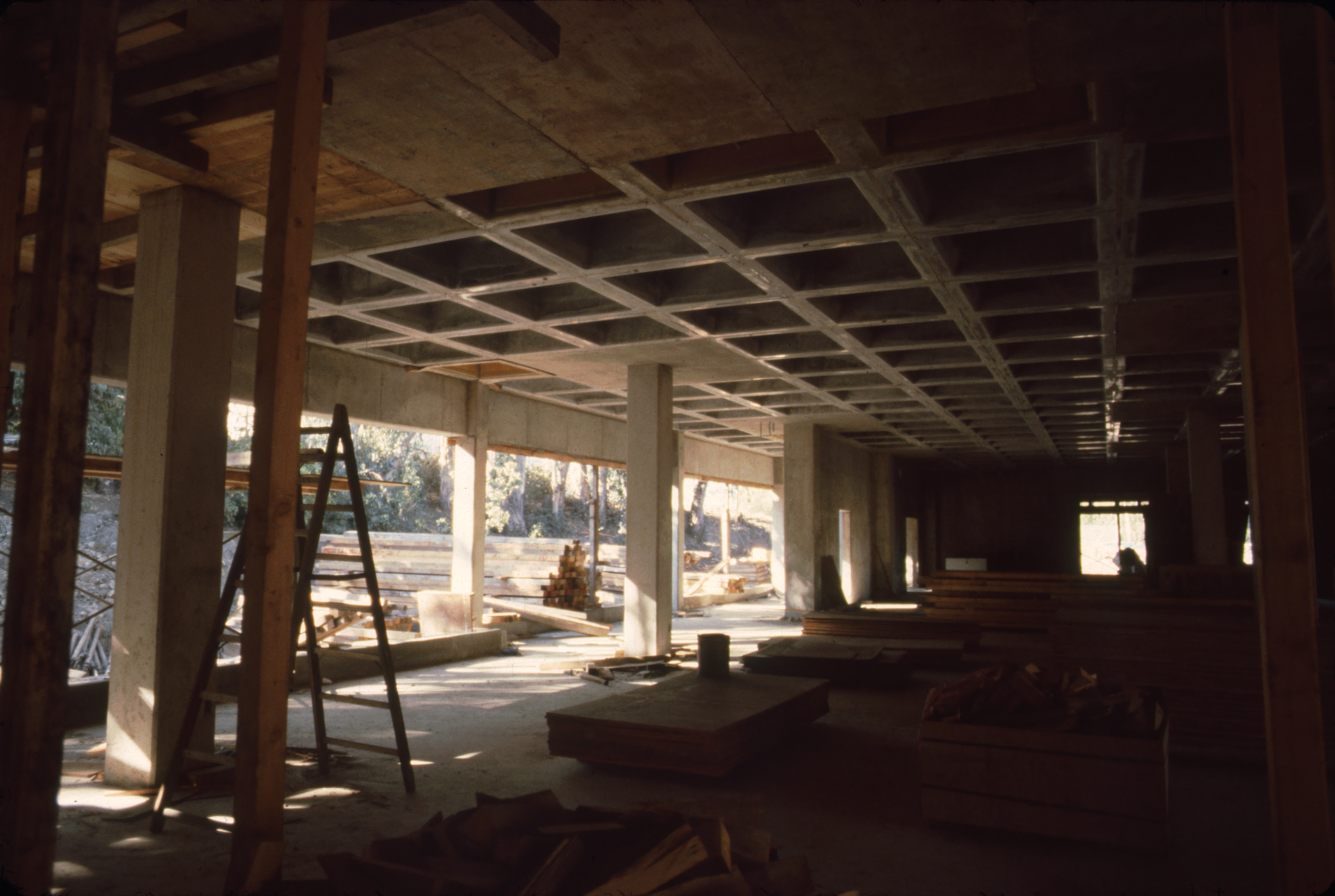 Construction on the first floor of Kennedy Library, before windows were installed. Materials used during the process of completing the building are visible.