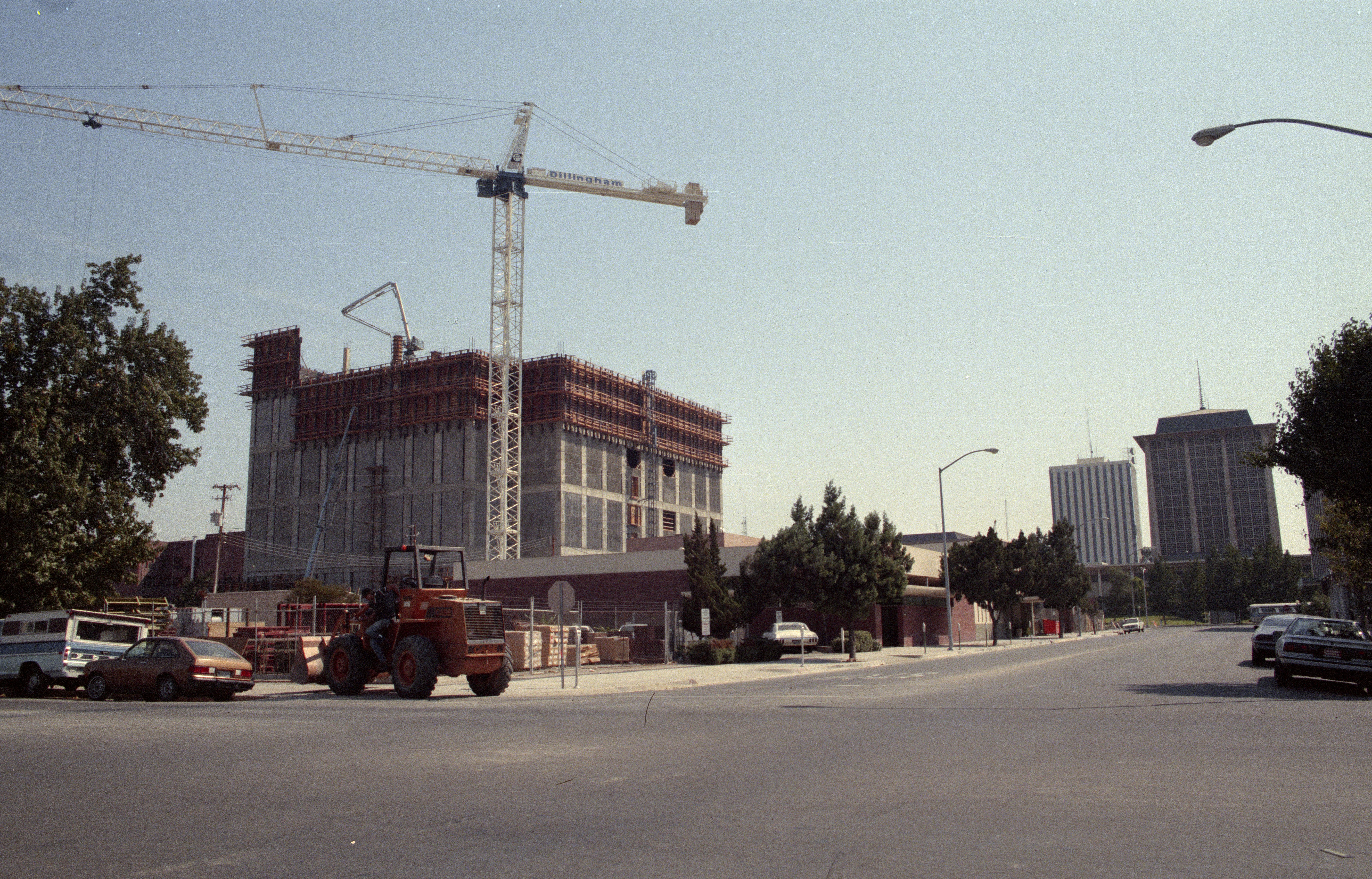 Construction of Fresno County Jail Annex at M and Merced Streets Derrick crane; pouring cement into upper framed walls