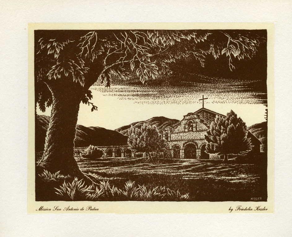 Linoleum cut print of Mission San Antonio de Padua on paper, pasted on front of greeting card. In cursive at bottom of card, Mission San Antonio de Padua by Friedolin Kessler