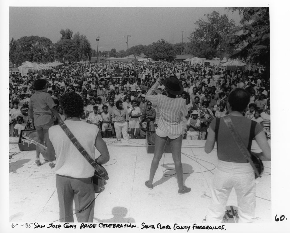 Band plays on stage in front of a large audience at the San Jose Gay Pride Celebration held at the Santa Clara County Fairgrounds.