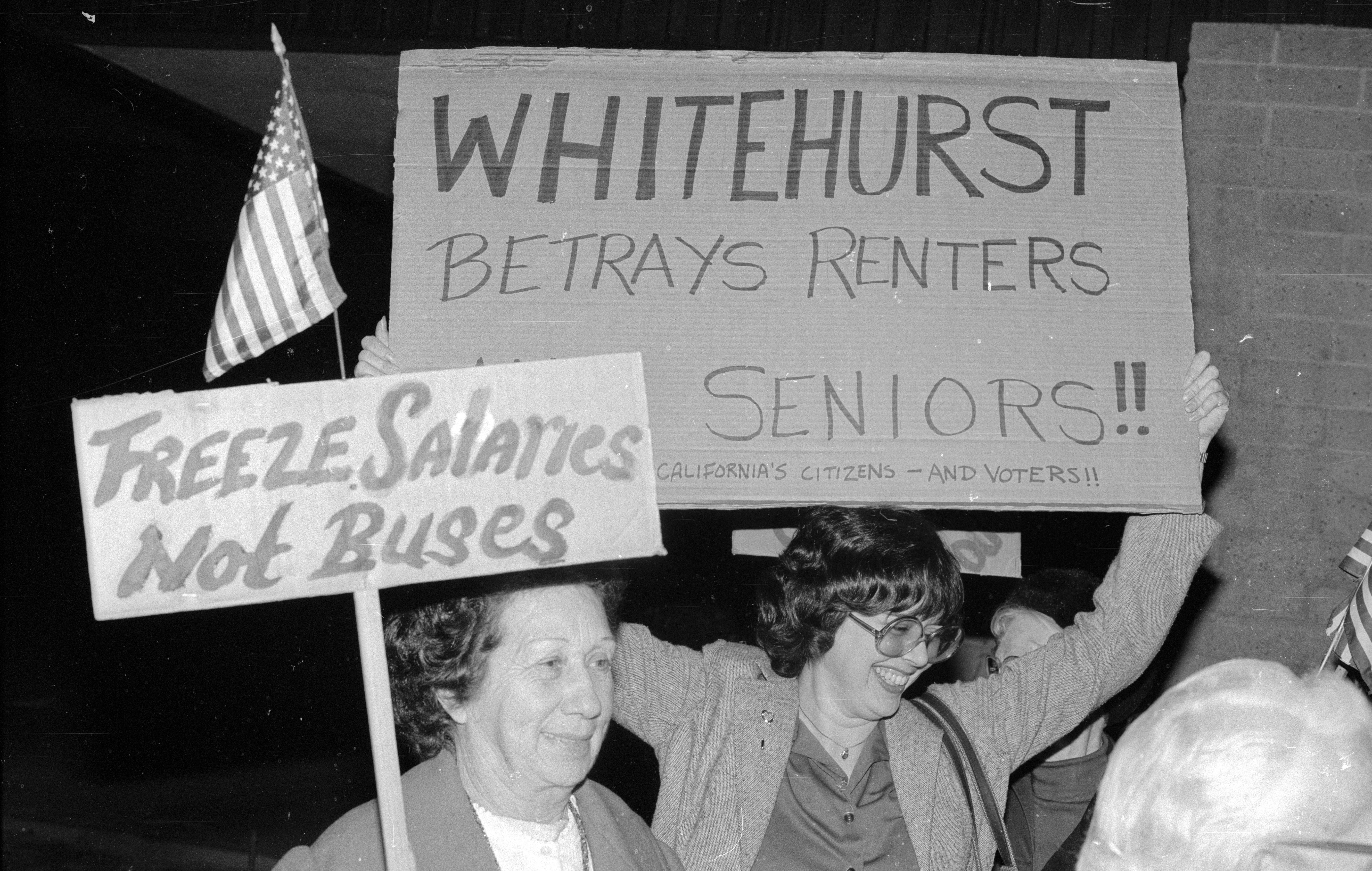 Woman carrying sign "Freeze Salaries, Not Buses" Kathy Reilley carrying WHITEHURST Betrays sign and smiling