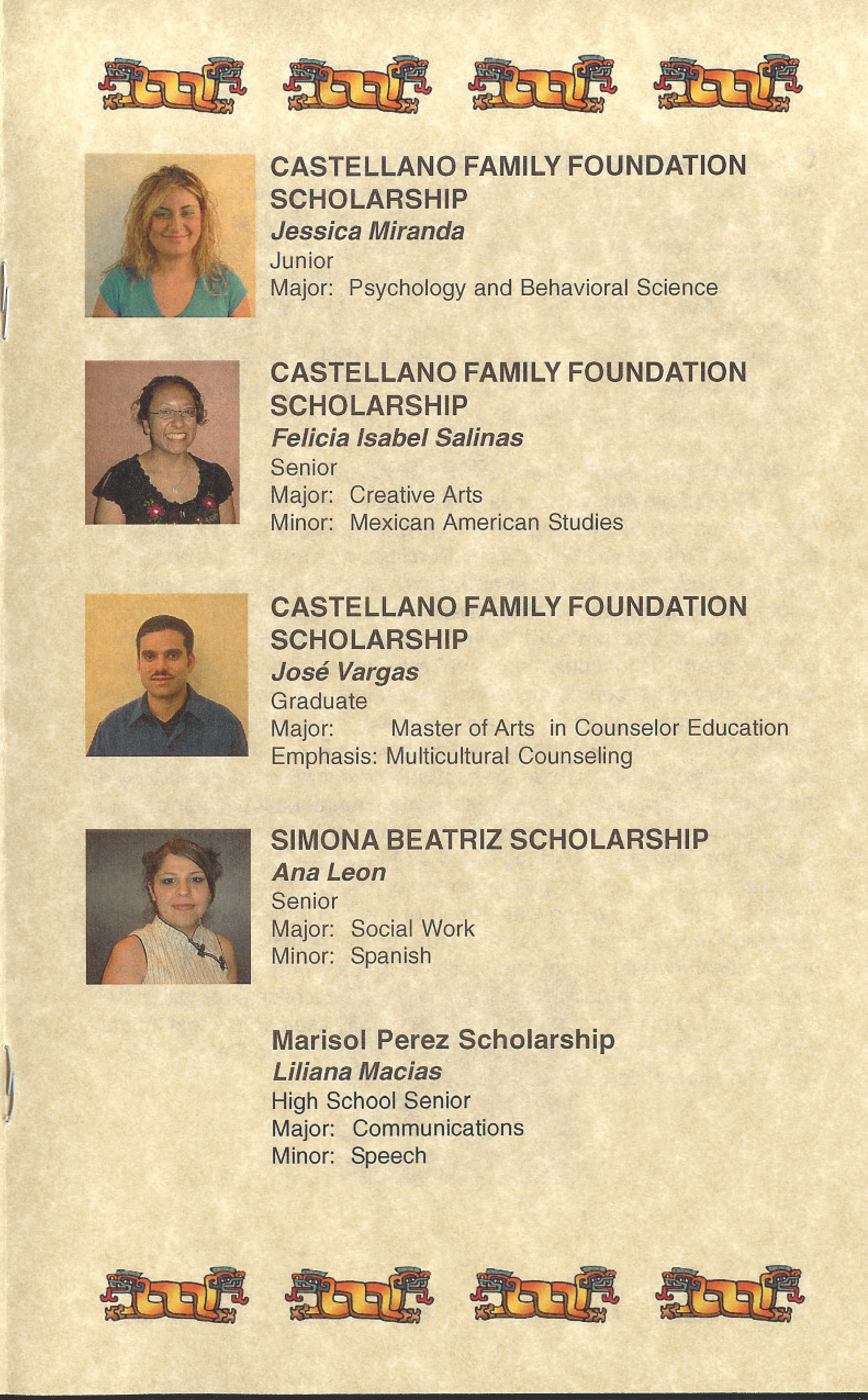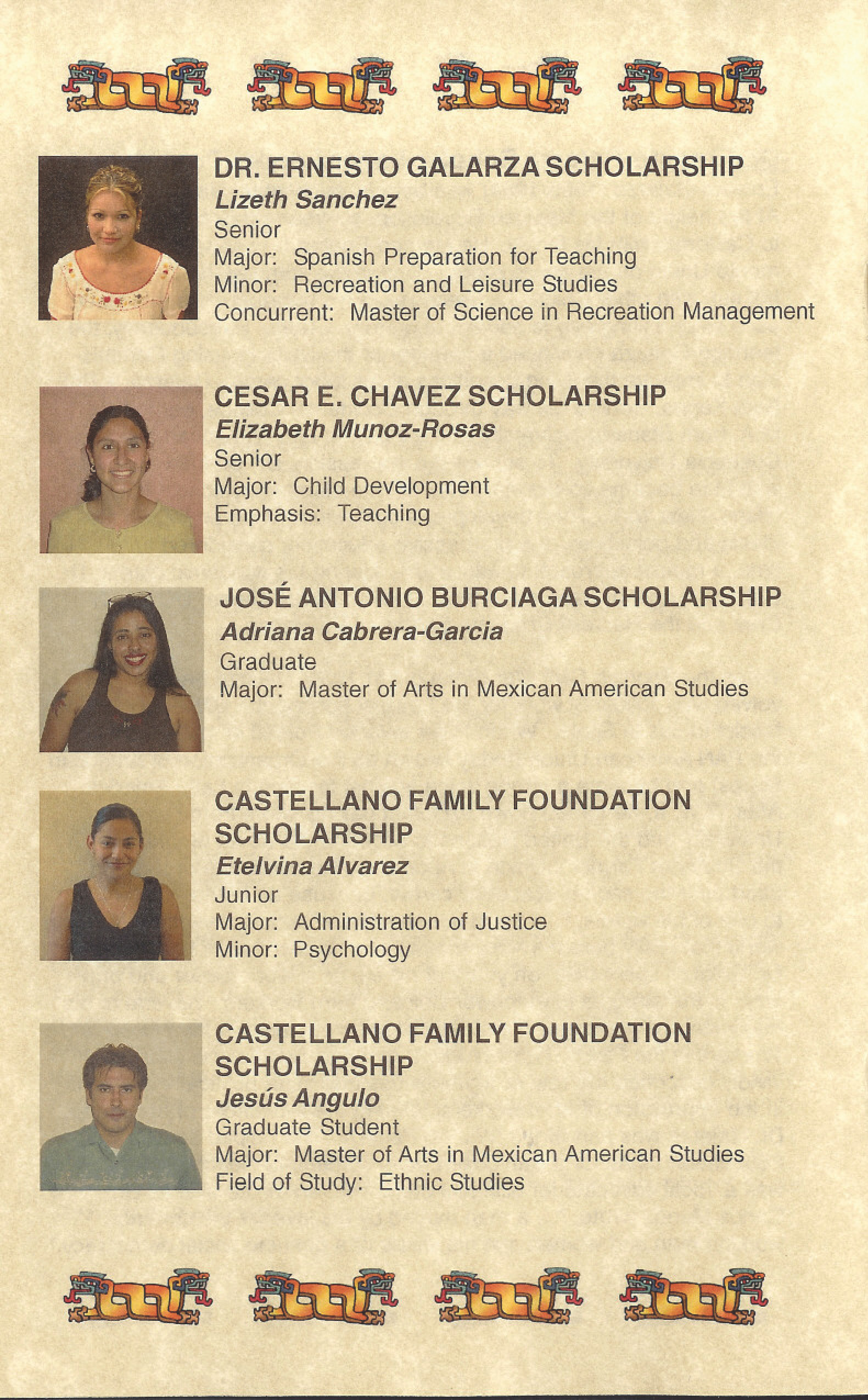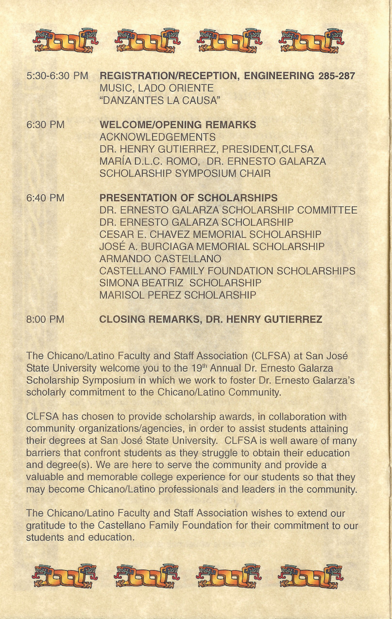 Program for the 19th Annual Dr. Ernesto Galarza Scholarship Symposium, held at San Jose State University on Friday, April 30, 2004 from 5:30 PM – 8:00 PM. The event included a Registration/Reception, Welcome/Opening Remarks by Dr. Henry Gutierrez (President, CLFSA) and Maria D.L.C. Romo (Dr. Ernesto Galarza Scholarship Symposium Chair), Presentation of Scholarships by the Dr. Ernesto Galarza Scholarship Committee, and Closing Remarks by Dr. Henry Gutierrez. Ten awards were presented: Dr Ernesto Galarza Scholarship, Cesar E. Chavez Scholarship, José Antonio Burciaga Scholarship, Castellano Family Foundation Scholarship (five awards), Simona Beatriz Scholarship, and Marisol Perez Scholarship.