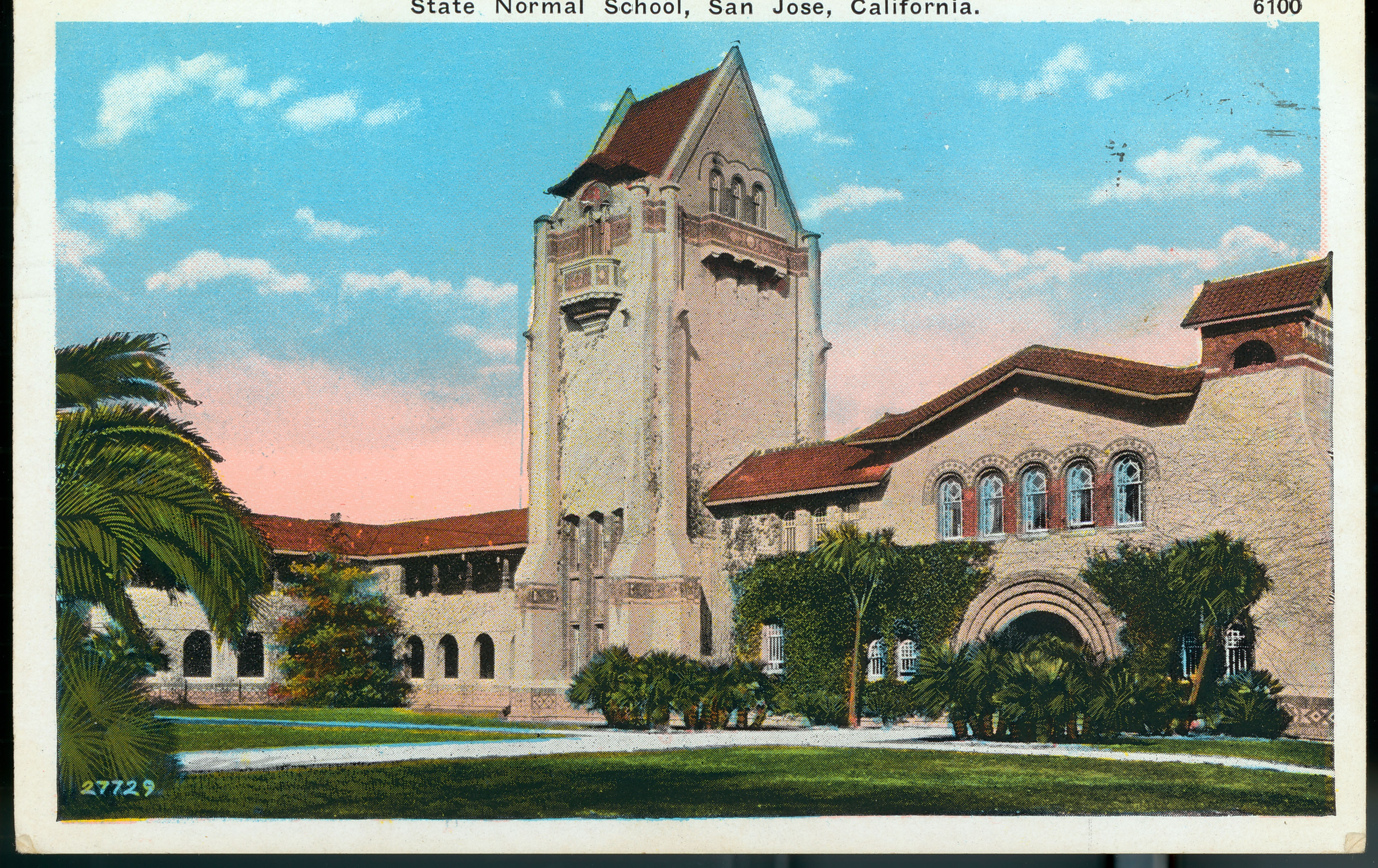 A postcard of the State Normal School, San Jose, California. Tower Hall is prominent on the postcard.