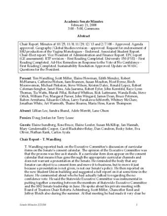 Chair Report. Minutes of 10/25; 11/8; 11/29; 12/13 and 2/7/08 – Approved. Agenda approved. Geography/Global Studies revision – approved. Request for endorsement of SSU production of the Vagina Monologues – Endorsed. Associated Student Report. Chair-Elect report. Vice President of Administration and Finance Report. EPC report (GE assessment). RTP revision – First Reading Completed. University 150 (FYE) – First Reading Completed. Ad-Hoc Remedies on Response to the Vote of No Confidence – First Reading Completed. Sustainability Resolution Approved. Update on WASC. Questions for the President.