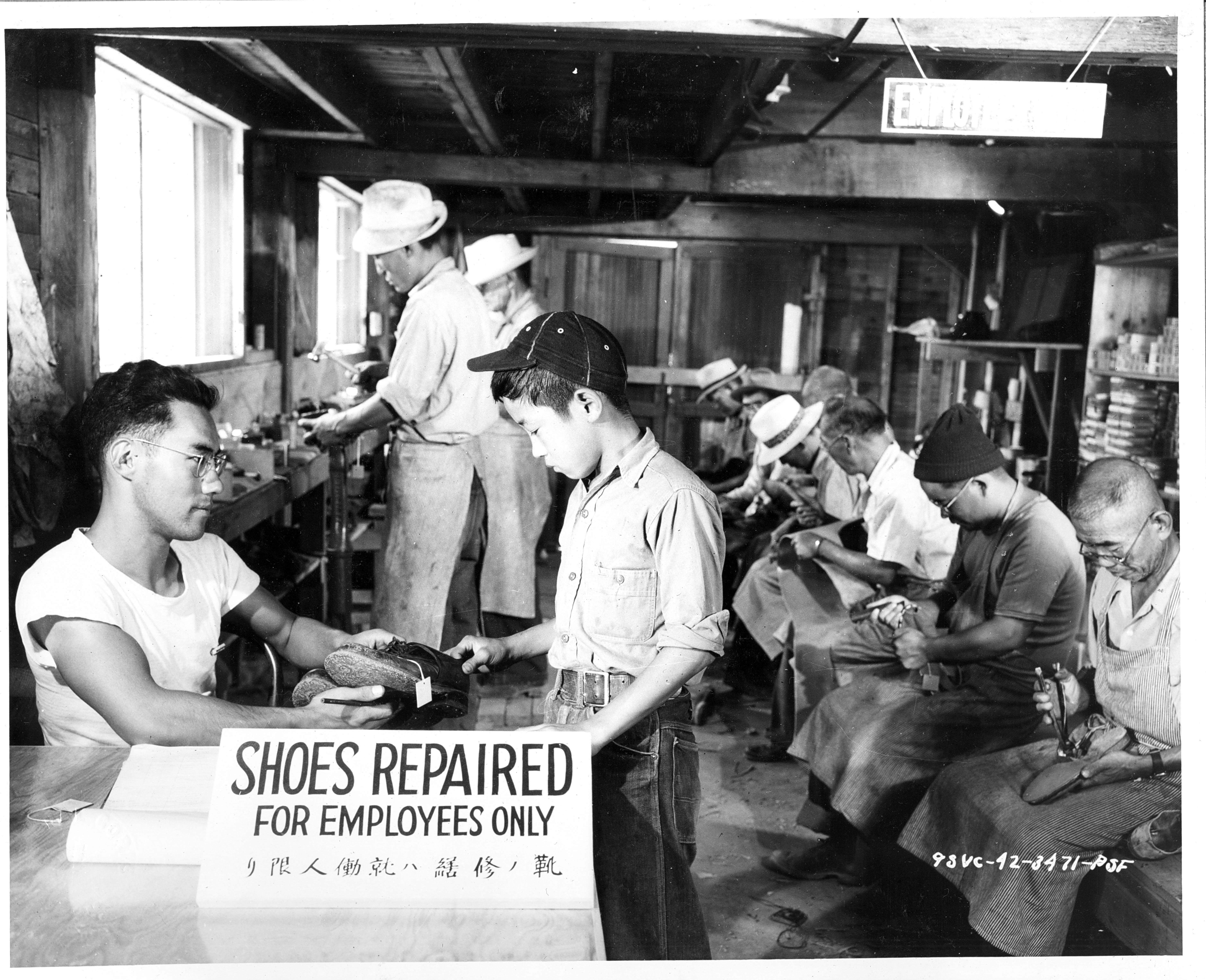 Photograph shows a busy shoe repair shop at Stockton Assembly Center, California.