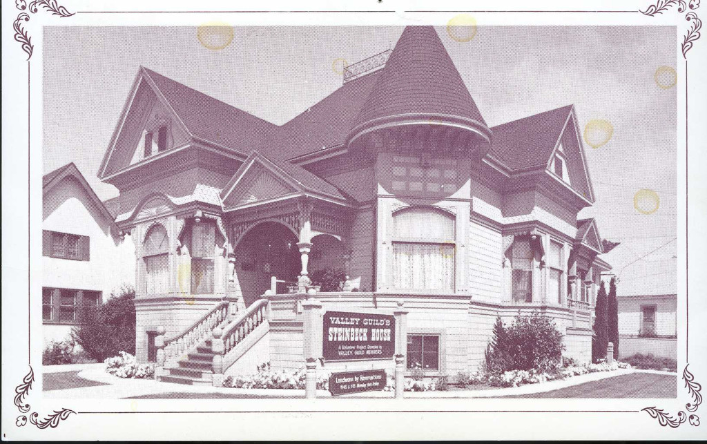 Postcard for the Steinbeck House Restaurant. Built in 1897 in the Queen Anne-style and purchased by the Steinbecks in 1900. Steinbeck was born in the bedroom to the left of the entrance. The text on the back of the postcard reads "The Steinbeck House. 132 Central Avenue - Salinas, Calif. 93901. Birthplace and boyhood home of American author John Steinbeck. 1940 Pulitzer Prize winner and 1962 Nobel Prize recipient. Valley Guild, a non-profit corporation, now owns and amintains the Steinbeck House as a volunteer restaurant and gift shop whose proceeds go to Salinas Valley charities."