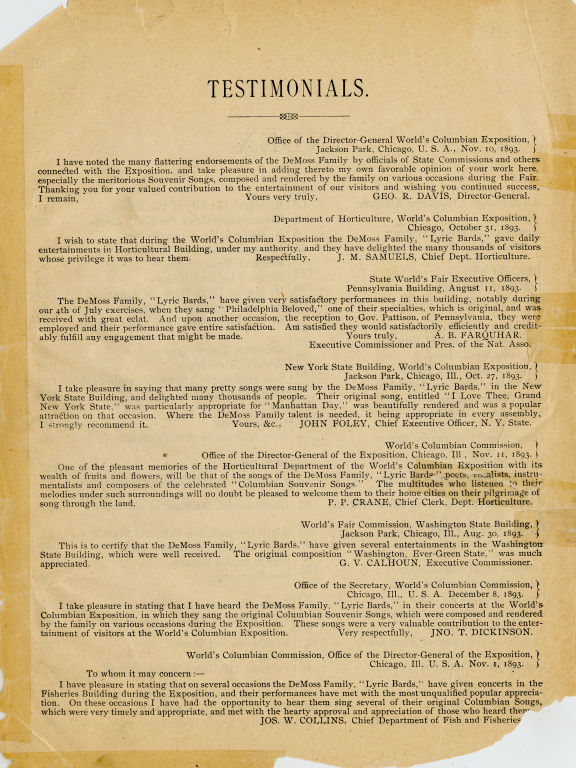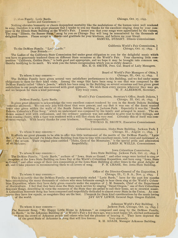 Piano scores,163 p., illus., contains 59 songs, most of which relate to U.S. states. DeMoss were official song-writers of the Worlds Columbian Exposition, Chicago, U.S.A., 1893.