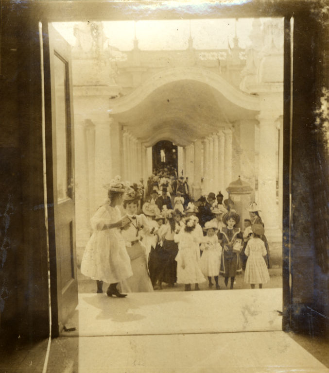 Children walking through colonnade